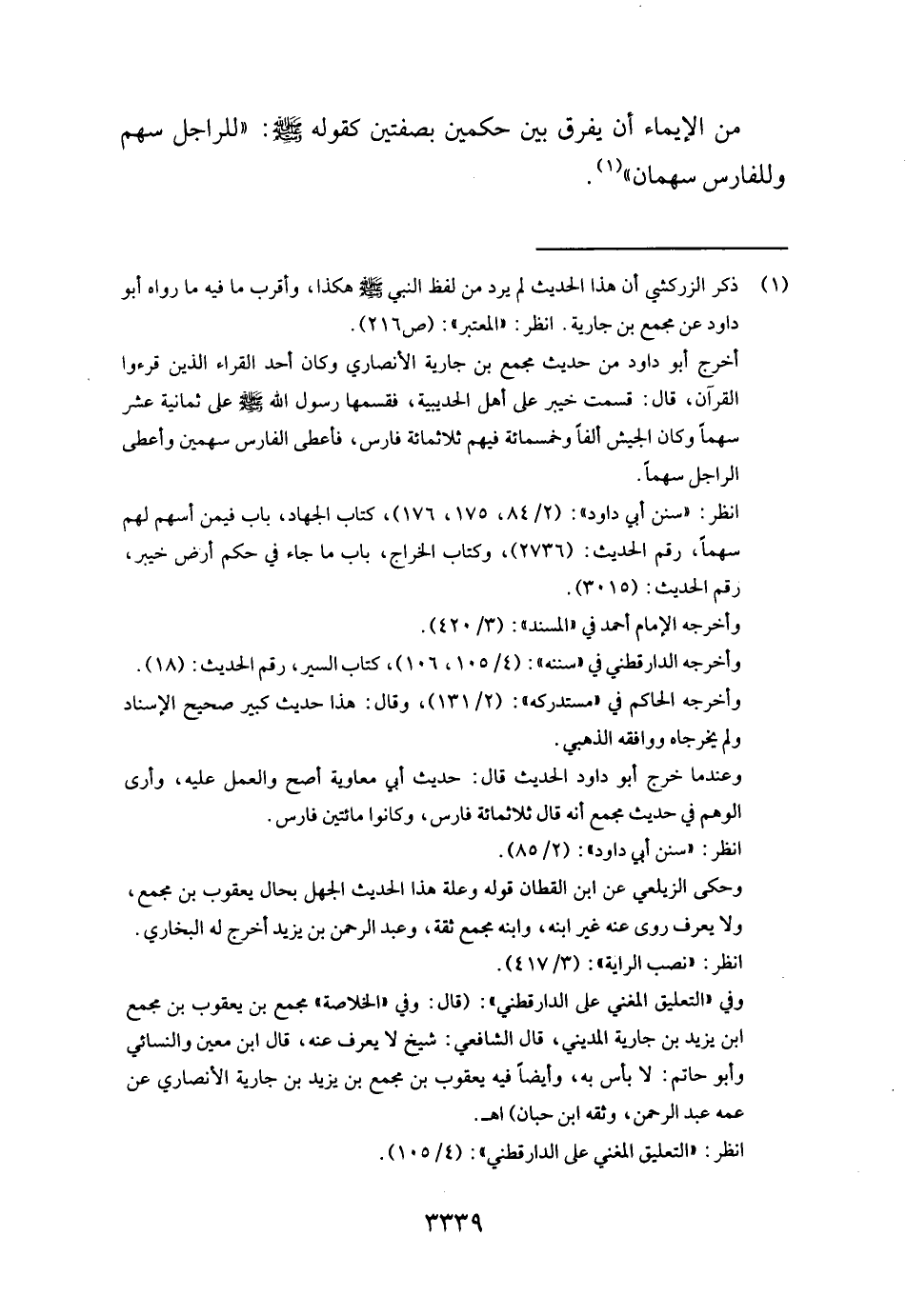 من الْإِيمَاء أَن يفرق بَين حكمين بصفتين كَقَوْلِه - صَلَّى اللَّهُ عَلَيْهِ وَسَلَّم َ -: " للراجل سهم وللفارس سَهْمَان ".