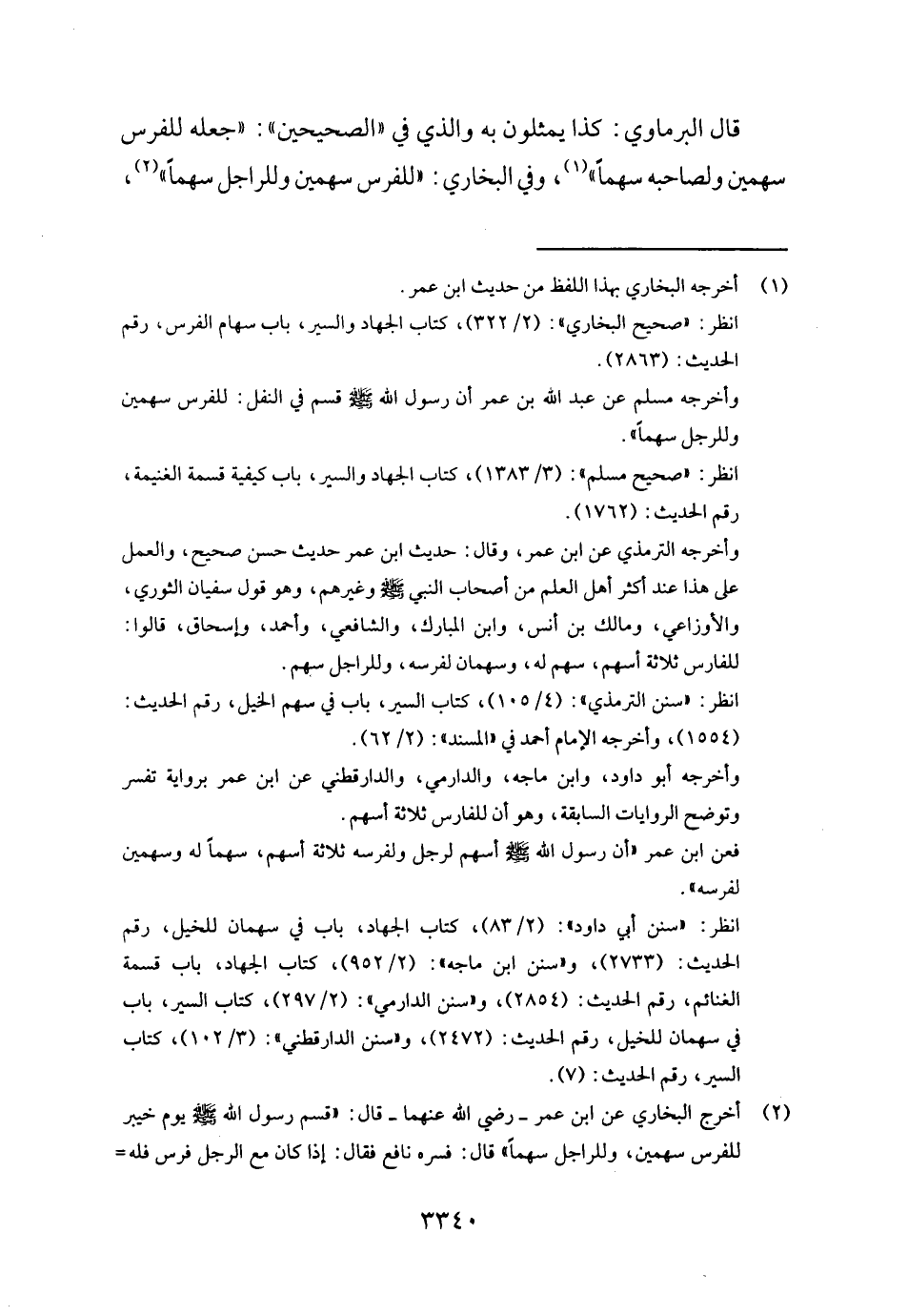 قَالَ الْبرمَاوِيّ: كَذَا يمثلون بِهِ وَالَّذِي فِي " الصَّحِيحَيْنِ ": " جعله للْفرس سَهْمَيْنِ ولصاحبه سَهْما "، وَفِي البُخَارِيّ: " للْفرس سَهْمَيْنِ وللراجل سَهْما،