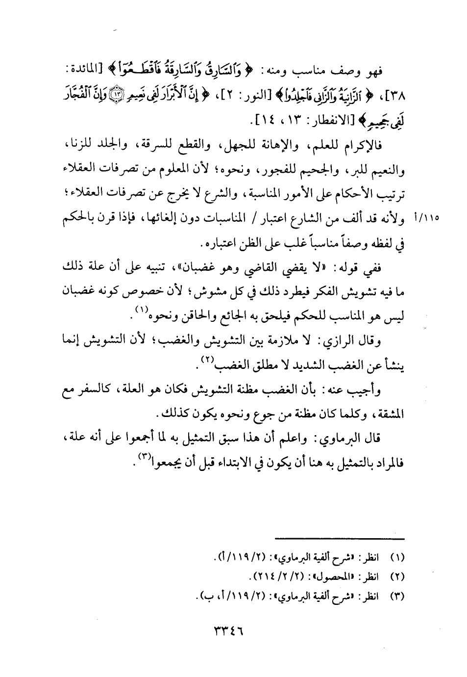 فالإكرام للْعلم، والإهانة للْجَهْل، وَالْقطع للسرقة، وَالْجَلد للزِّنَا وَالنَّعِيم للبر، والجحيم للفجور، وَنَحْوه؛ لِأَن الْمَعْلُوم من تَصَرُّفَات الْعُقَلَاء تَرْتِيب الْأَحْكَام على الْأُمُور الْمُنَاسبَة، وَالشَّرْع لَا يخرج عَن تَصَرُّفَات الْعُقَلَاء؛ وَلِأَنَّهُ قد ألف من الشَّارِع اعْتِبَار / المناسبات دون إلغائها، فَإِذا قرن بالحكم فِي لَفظه وَصفا مناسبا غلب على الظَّن اعْتِبَاره.