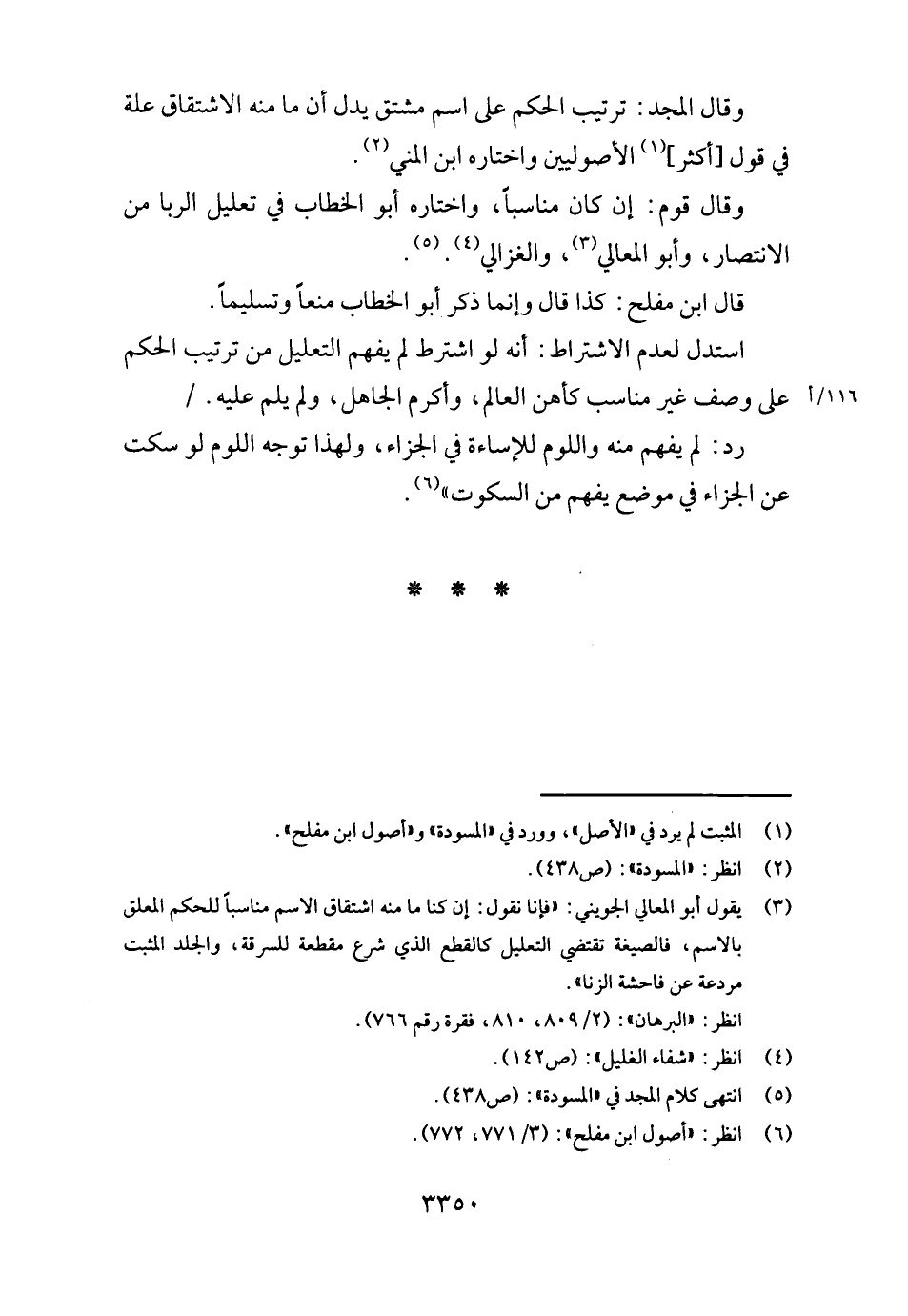قَالَ ابْن مُفْلِح: كَذَا قَالَ وَإِنَّمَا ذكر أَبُو الْخطاب منعا وتسليما. اسْتدلَّ لعدم الِاشْتِرَاط: أَنه لَو اشْترط لم يفهم التَّعْلِيل من تَرْتِيب الحكم على وصف غير مُنَاسِب كأهن الْعَالم، وَأكْرم الْجَاهِل، وَلم يلم عَلَيْهِ. / رد: لم يفهم مِنْهُ واللوم للإساءة فِي الْجَزَاء، وَلِهَذَا توجه اللوم لَو سكت عَن الْجَزَاء فِي مَوضِع يفهم من السُّكُوت ".