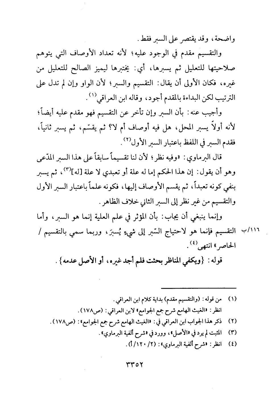 والتقسيم مقدم فِي الْوُجُود عَلَيْهِ؛ لِأَنَّهُ تعداد الْأَوْصَاف الَّتِي يتَوَهَّم صلاحيتها للتَّعْلِيل ثمَّ يسبرها، أَي: يختبرها ليميز الصَّالح للتَّعْلِيل من غَيره، فَكَانَ الأولى أَن يُقَال: التَّقْسِيم والسبر؛ لِأَن الْوَاو وَإِن لم تدل على التَّرْتِيب لَكِن الْبدَاءَة بالمقدم أَجود، وَقَالَهُ ابْن الْعِرَاقِيّ.