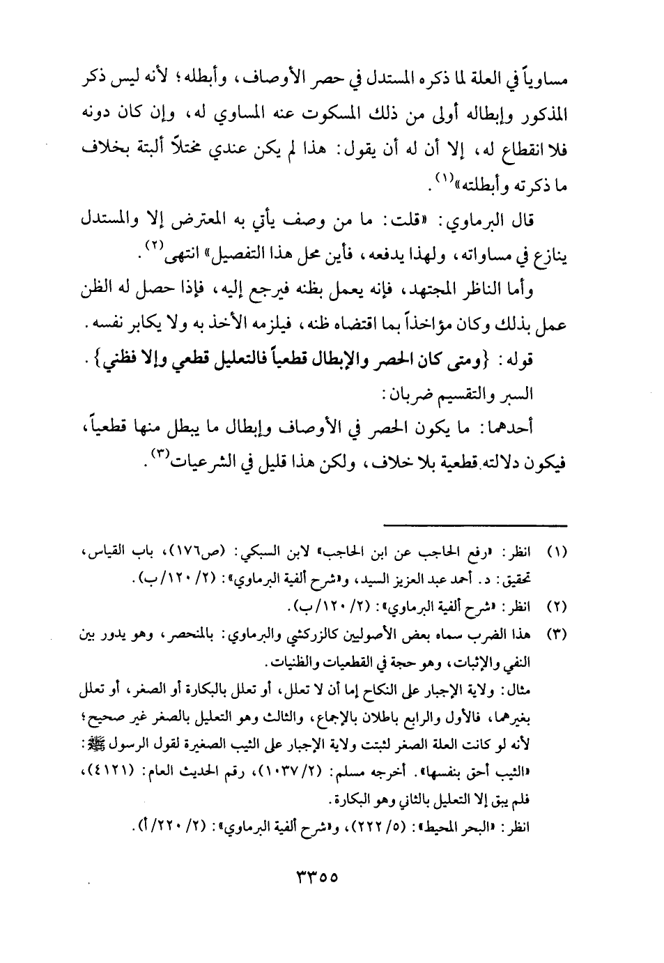 قَوْله: [وَمَتى كَانَ الْحصْر والإبطال قَطْعِيا فالتعليل قَطْعِيّ وَإِلَّا فظني] . السبر والتقسيم ضَرْبَان: أَحدهمَا: مَا يكون الْحصْر فِي الْأَوْصَاف وَإِبْطَال مَا يبطل مِنْهَا قَطْعِيا فَيكون دلَالَته قَطْعِيَّة بِلَا خلاف، وَلَكِن هَذَا قَلِيل فِي الشرعيات.