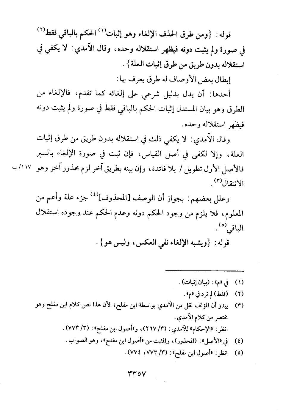 وَقَالَ الْآمِدِيّ: لَا يَكْفِي ذَلِك فِي استقلاله بِدُونِ طَرِيق من طرق إِثْبَات الْعلَّة، وَإِلَّا لكفى فِي أصل الْقيَاس، فَإِن ثَبت فِي صُورَة الإلغاء بالسبر فَالْأَصْل الأول تَطْوِيل / بِلَا فَائِدَة، وَإِن بَينه بطرِيق آخر لزم مَحْذُور آخر وَهُوَ الِانْتِقَال.