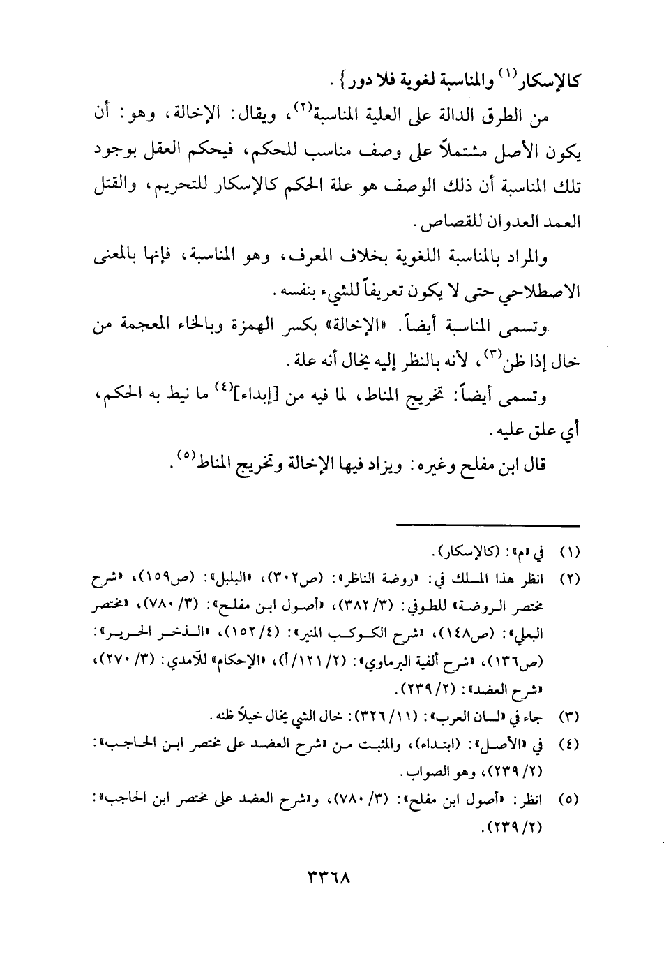 وَالْمرَاد بالمناسبة اللُّغَوِيَّة بِخِلَاف الْمُعَرّف، وَهُوَ الْمُنَاسبَة، فَإِنَّهَا بِالْمَعْنَى الاصطلاحي حَتَّى لَا يكون تعريفا للشَّيْء بِنَفسِهِ. وَتسَمى الْمُنَاسبَة أَيْضا: " الإخالة " بِكَسْر الْهمزَة وبالخاء الْمُعْجَمَة من خَال إِذا ظن، لِأَنَّهُ بِالنّظرِ إِلَيْهِ يخال أَنه عِلّة. وَتسَمى أَيْضا: تَخْرِيج المناط، لما فِيهِ من [إبداء] مَا نيط بِهِ الحكم، أَي علق عَلَيْهِ.