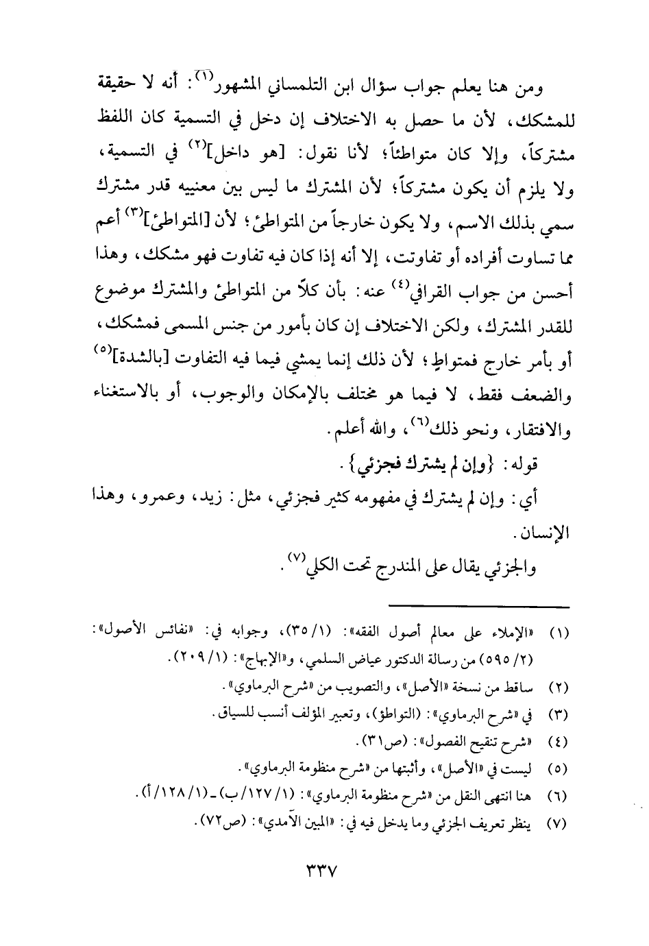 وَمن هُنَا يعلم جَوَاب سُؤال ابْن التلمساني الْمَشْهُور: أَنه لَا حَقِيقَة للمشكك، لِأَن مَا حصل بِهِ الِاخْتِلَاف إِن دخل فِي التَّسْمِيَة كَانَ اللَّفْظ مُشْتَركا، وَإِلَّا كَانَ متواطئاً؛ لأَنا نقُول: [هُوَ دَاخل] فِي التَّسْمِيَة، وَلَا يلْزم أَن يكون مُشْتَركا؛ لِأَن الْمُشْتَرك مَا لَيْسَ بَين معنييه قدر مُشْتَرك سمي بذلك الِاسْم، وَلَا يكون خَارِجا من المتواطئ؛ لِأَن [المتواطئ] أَعم مِمَّا تَسَاوَت أَفْرَاده أَو تفاوتت، إِلَّا أَنه إِذا كَانَ فِيهِ تفَاوت فَهُوَ مشكك، وَهَذَا أحسن من جَوَاب الْقَرَافِيّ عَنهُ: بِأَن كلا من المتواطئ والمشترك مَوْضُوع للقدر الْمُشْتَرك، وَلَكِن الِاخْتِلَاف إِن كَانَ بِأُمُور من جنس الْمُسَمّى فمشكك أَو بِأَمْر خَارج فمتواط؛ لِأَن ذَلِك إِنَّمَا يمشي فِيمَا فِيهِ التَّفَاوُت [بالشدة] والضعف فَقَط، لَا فِيمَا هُوَ مُخْتَلف بالإمكان وَالْوُجُوب، أَو بالاستغناء والافتقار، وَنَحْو ذَلِك، وَالله أعلم.