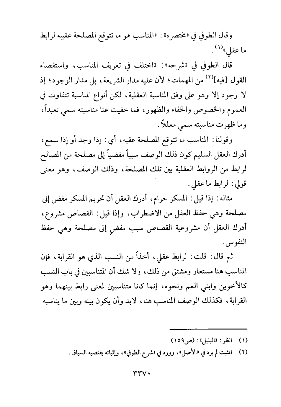وَقَالَ الطوفي فِي " مُخْتَصره ": الْمُنَاسب هُوَ مَا تتَوَقَّع الْمصلحَة عَقِيبه لرابط مَا عَقْلِي ".