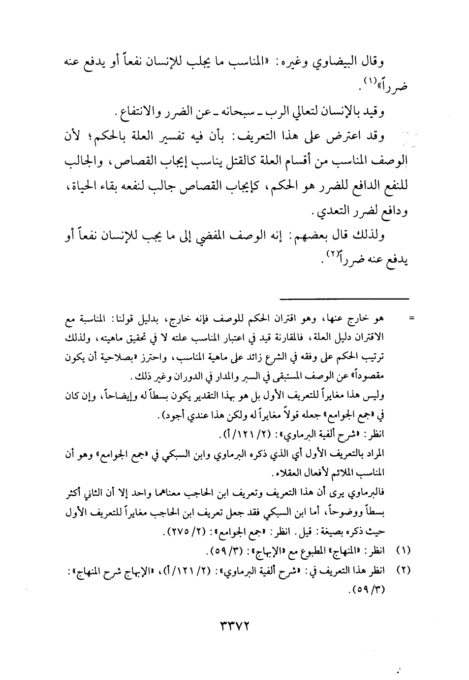 وَقد اعْترض على هَذَا التَّعْرِيف: بِأَن فِيهِ تَفْسِير الْعلَّة بالحكم؛ لِأَن الْوَصْف الْمُنَاسب من أَقسَام الْعلَّة كَالْقَتْلِ يُنَاسب إِيجَاب الْقصاص، والجالب للنفع الدَّافِع لضررهو الحكم، كإيجاب الْقصاص جالب لنفعه بَقَاء الْحَيَاة، ودافع لضَرَر التَّعَدِّي.