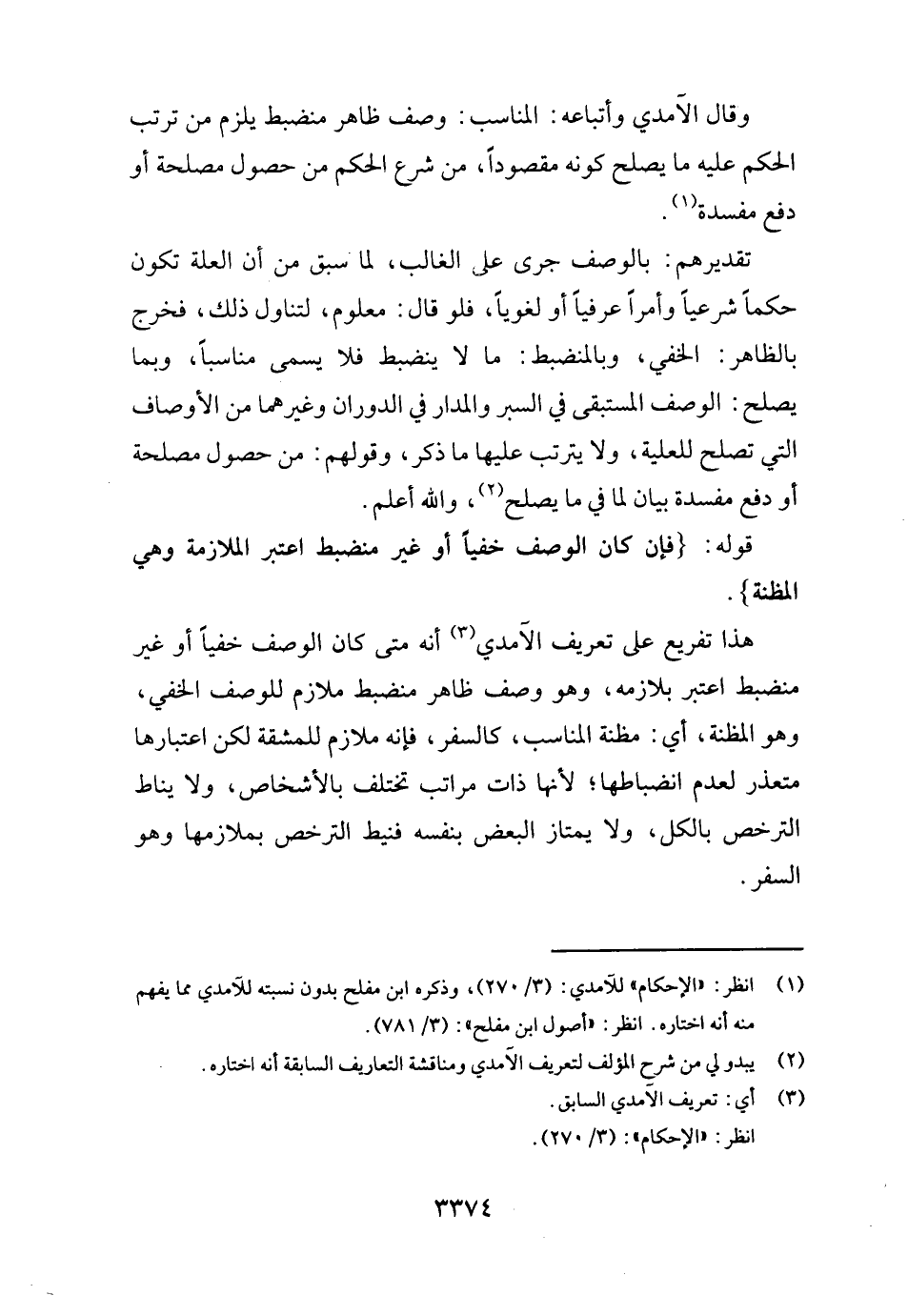 هَذَا تَفْرِيع على تَعْرِيف الْآمِدِيّ أَنه مَتى كَانَ الْوَصْف خفِيا أَو غير منضبط اعْتبر بلازمه، وَهُوَ وصف ظَاهر منضبط ملازم للوصف الْخَفي، وَهُوَ المظنة، أَي: مَظَنَّة الْمُنَاسب، كالسفر، فَإِنَّهُ ملازم للْمَشَقَّة لَكِن اعْتِبَارهَا مُتَعَذر لعدم انضباطها؛ لِأَنَّهَا ذَات مَرَاتِب تخْتَلف بالأشخاص، وَلَا يناط التَّرَخُّص بِالْكُلِّ، وَلَا يمتاز الْبَعْض بِنَفسِهِ فنيط التَّرَخُّص بملازمها وَهُوَ السّفر.