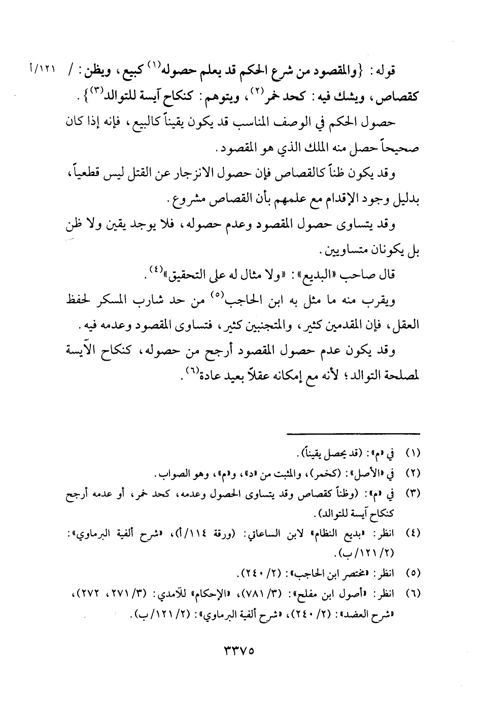 قَوْله: [وَالْمَقْصُود من شرع الحكم قد يعلم حُصُوله كَبيع، ويظن: / كقصاص، ويشك فِيهِ: كَحَد خمر، ويتوهم: كَنِكَاح آيسة للتوالد] .