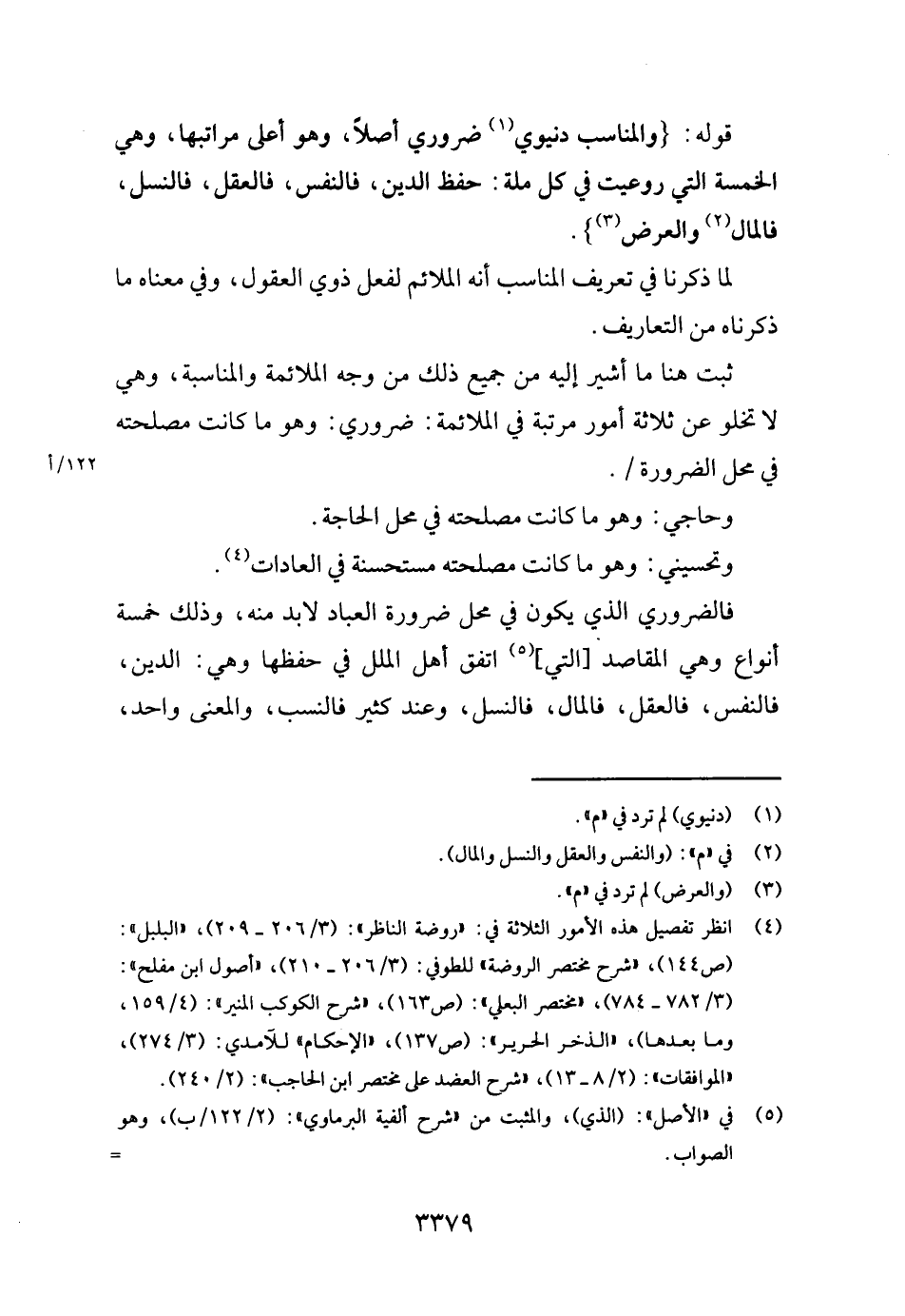 فالضروري الَّذِي يكون فِي مَحل ضَرُورَة الْعباد لابد مِنْهُ، وَذَلِكَ خَمْسَة أَنْوَاع وَهِي الْمَقَاصِد [الَّتِي] اتّفق أهل الْملَل فِي حفظهَا وَهِي: الدّين، فَالنَّفْس، فالعقل، فَالْمَال، فالنسل، وَعند كثير فالنسب، وَالْمعْنَى وَاحِد،