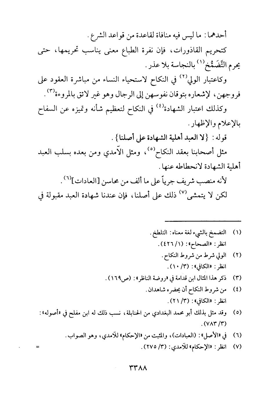 مثل أَصْحَابنَا بِعقد النِّكَاح، وَمثل الْآمِدِيّ وَمن بعده بسلب العَبْد أَهْلِيَّة الشَّهَادَة لانحطاطه عَنْهَا.