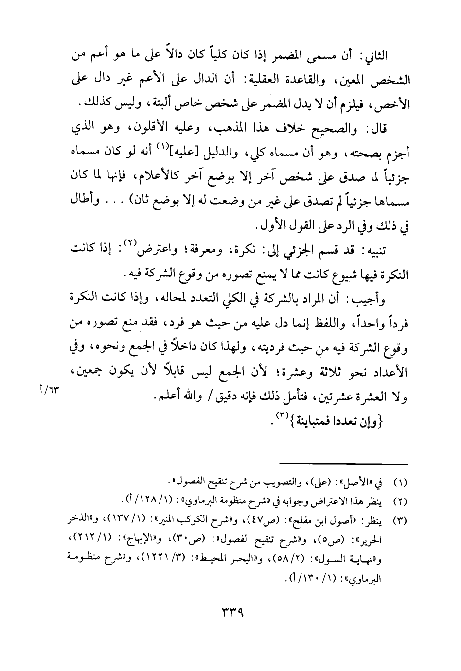 وَأجِيب: أَن المُرَاد بِالشّركَةِ فِي الْكُلِّي التَّعَدُّد لمحاله، وَإِذا كَانَت النكرَة فَردا وَاحِدًا، وَاللَّفْظ إِنَّمَا دلّ عَلَيْهِ من حَيْثُ هُوَ فَرد، فقد منع تصَوره من وُقُوع الشّركَة فِيهِ من حَيْثُ فرديته، وَلِهَذَا كَانَ دَاخِلا فِي الْجمع وَنَحْوه، وَفِي الْأَعْدَاد نَحْو ثَلَاثَة وَعشرَة؛ لِأَن الْجمع لَيْسَ قَابلا لِأَن يكون جمعين، وَلَا الْعشْرَة عشرتين، فَتَأمل ذَلِك فَإِنَّهُ دَقِيق / وَالله أعلم.
