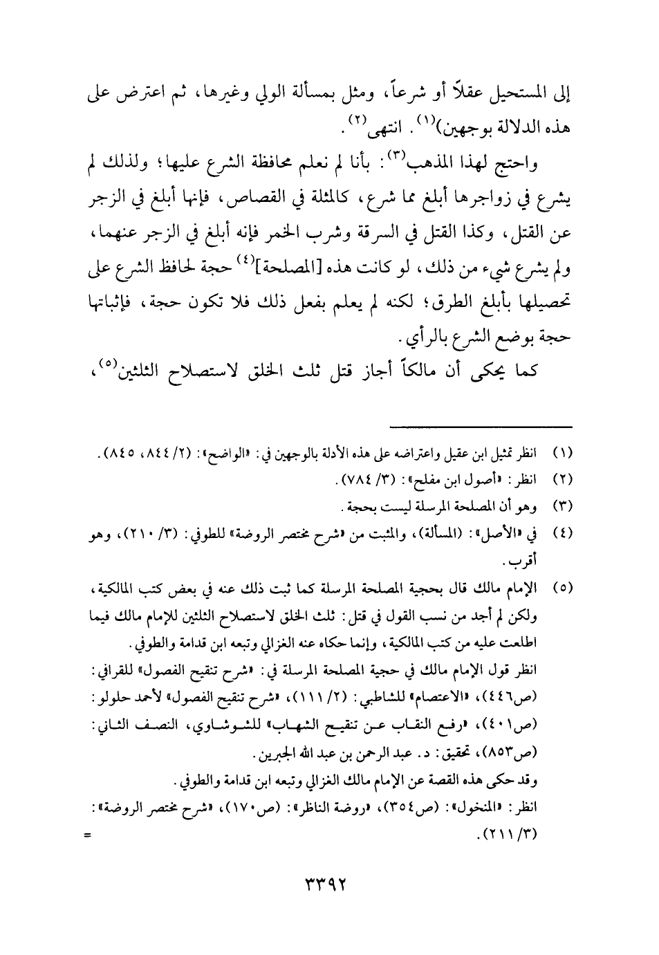 وَاحْتج لهَذَا الْمَذْهَب: بِأَنا لم نعلم مُحَافظَة الشَّرْع عَلَيْهَا؛ وَلذَلِك لم يشرع فِي زواجرها أبلغ مِمَّا شرع، كالمثلة فِي الْقصاص، فَإِنَّهَا أبلغ فِي الزّجر عَن الْقَتْل، وَكَذَا الْقَتْل فِي السّرقَة وَشرب الْخمر فَإِنَّهُ أبلغ فِي الزّجر عَنْهُمَا، وَلم يشرع شَيْء من ذَلِك، لَو كَانَت هَذِه [الْمصلحَة] حجَّة لحافظ الشَّرْع على تَحْصِيلهَا بأبلغ الطّرق؛ لكنه لم يعلم بِفعل ذَلِك فَلَا تكون حجَّة، فإثباتها حجَّة بِوَضْع الشَّرْع بِالرَّأْيِ.