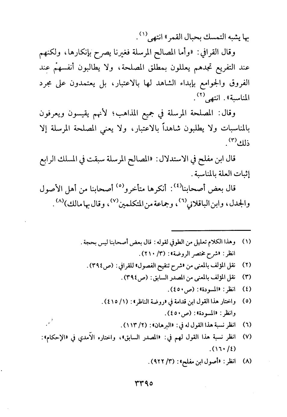 وَقَالَ الْقَرَافِيّ: " وَأما الْمصَالح الْمُرْسلَة فغيرنا يُصَرح بإنكارها، وَلَكنهُمْ عِنْد التَّفْرِيع تجدهم يعللون بِمُطلق الْمصلحَة، وَلَا يطالبون أنفسهم عِنْد الفروق والجوامع بإبداء الشَّاهِد لَهَا بِالِاعْتِبَارِ، بل يعتمدون على مُجَرّد الْمُنَاسبَة ". انْتهى.