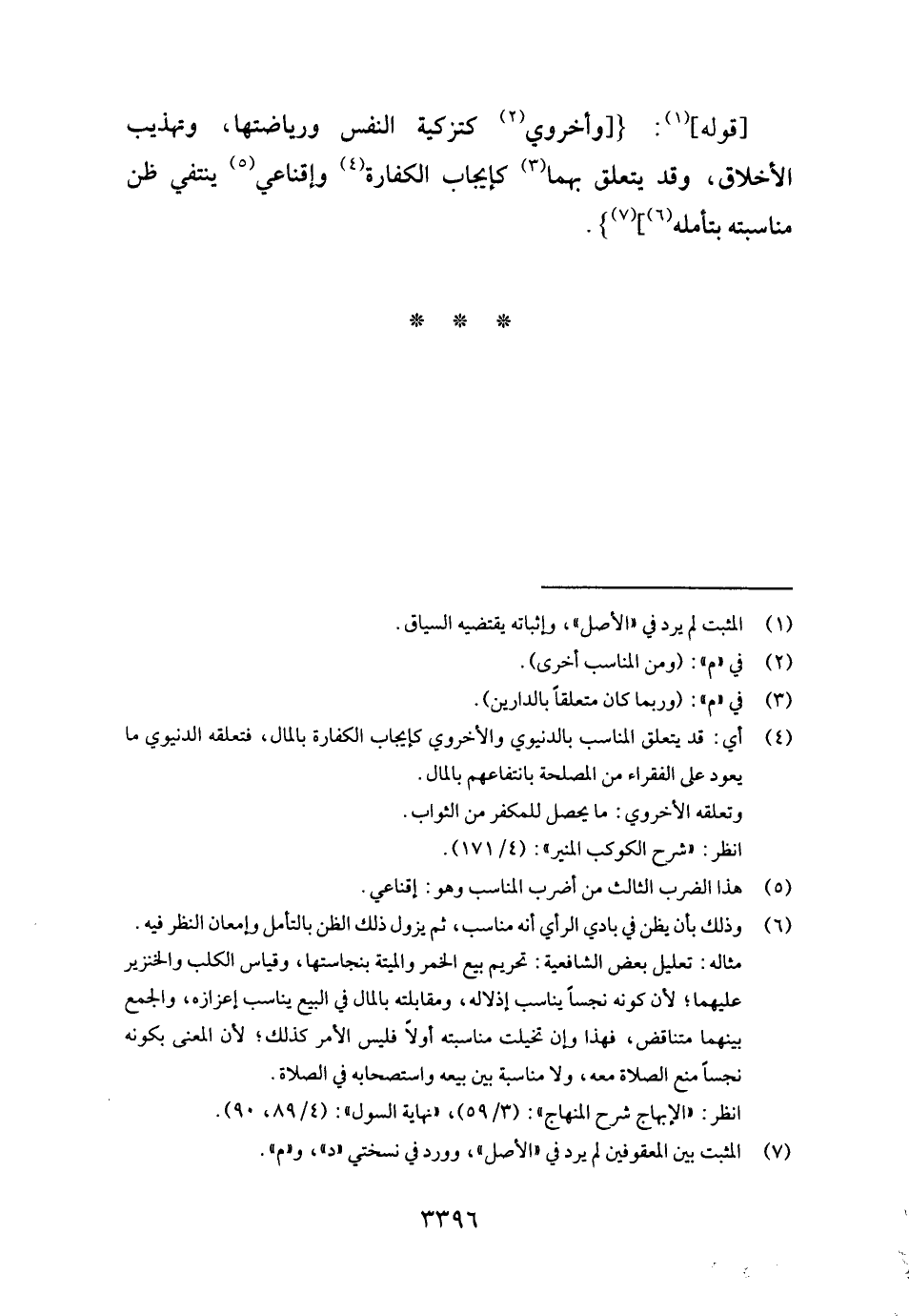 [قَوْله] : ((وأخروي كتزكية النَّفس ورياضتها، وتهذيب الْأَخْلَاق، وَقد يتَعَلَّق بهما كإيجاب الْكَفَّارَة وإقناعي يَنْتَفِي ظن مناسبته بتأمله] ) .