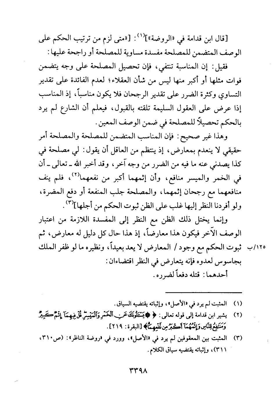 [قَالَ ابْن قدامَة فِي " الرَّوْضَة "] : [" مَتى لزم من تَرْتِيب الحكم على الْوَصْف المتضمن للْمصْلحَة مفْسدَة مُسَاوِيَة للْمصْلحَة أَو راجحة عَلَيْهَا: