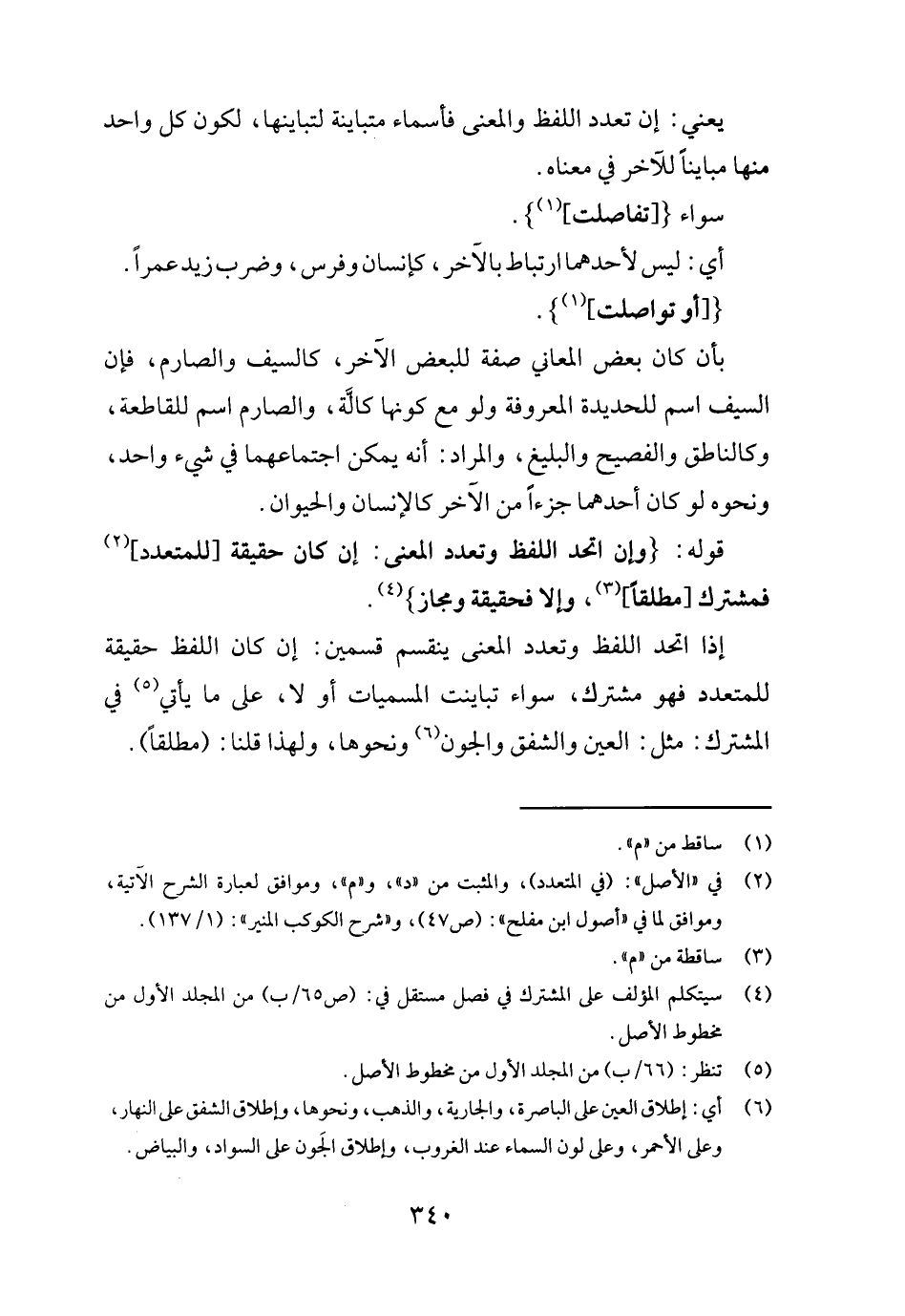 إِذا اتَّحد اللَّفْظ وتعدد الْمَعْنى يَنْقَسِم قسمَيْنِ: إِن كَانَ اللَّفْظ حَقِيقَة للمتعدد فَهُوَ مُشْتَرك، سَوَاء تباينت المسميات أَو لَا، على مَا يَأْتِي فِي الْمُشْتَرك: مثل: الْعين والشفق والجون وَنَحْوهَا، وَلِهَذَا قُلْنَا: (مُطلقًا) .