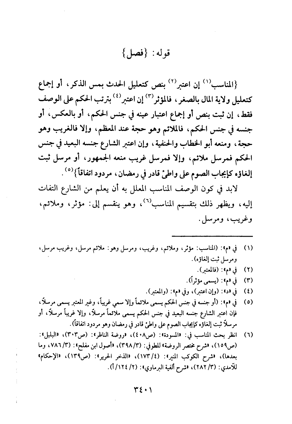 (الْمُنَاسب إِن اعْتبر بِنَصّ كتعليل الْحَدث بِمَسّ الذّكر، أَو إِجْمَاع كتعليل ولَايَة المَال بالصغر، فالمؤثر إِن اعْتبر بترتب الحكم على الْوَصْف فَقَط، إِن ثَبت بِنَصّ أَو إِجْمَاع اعْتِبَار عينه فِي جنس الحكم، أَو بِالْعَكْسِ، أَو جنسه فِي جنس الحكم، فالملائم وَهُوَ حجَّة عِنْد الْمُعظم، وَإِلَّا فالغريب وَهُوَ حجَّة، وَمنعه أَبُو الْخطاب وَالْحَنَفِيَّة، وَإِن اعْتبر الشَّارِع جنسه الْبعيد فِي جنس الحكم فمرسل ملائم، وَإِلَّا فمرسل غَرِيب مَنعه الْجُمْهُور، أَو مُرْسل ثَبت إلغاؤه كإيجاب الصَّوْم على واطىء قَادر فِي رَمَضَان، مَرْدُود اتِّفَاقًا) .