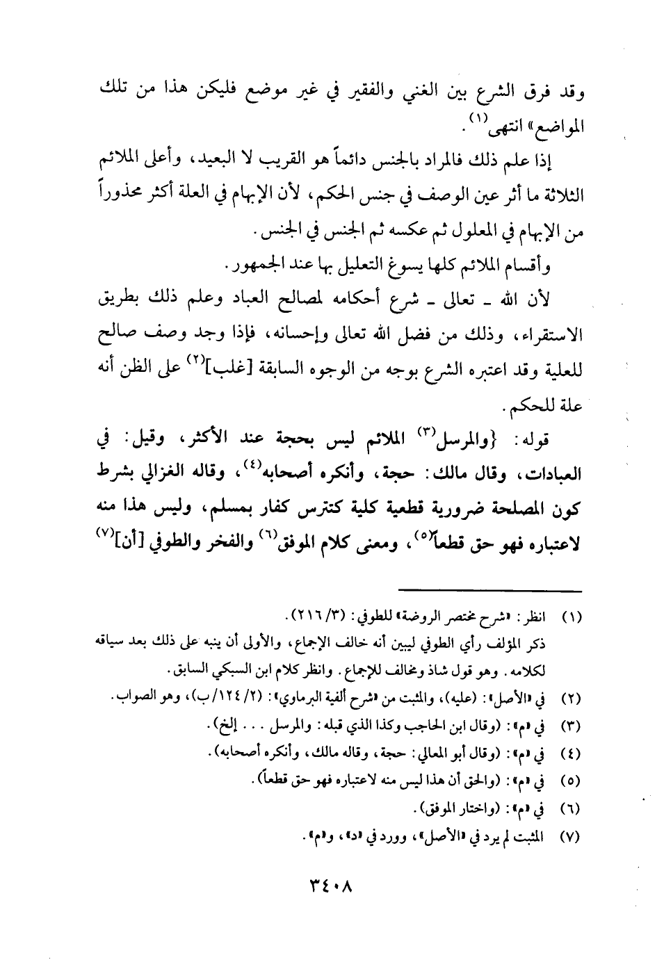 قَوْله: (والمرسل الملائم لَيْسَ بِحجَّة عِنْد الْأَكْثَر، وَقيل: فِي الْعِبَادَات، وَقَالَ مَالك: حجَّة، وَأنْكرهُ أَصْحَابه، وَقَالَهُ الْغَزالِيّ بِشَرْط كَون الْمصلحَة ضَرُورِيَّة قَطْعِيَّة كُلية كتترس كفار بِمُسلم، وَلَيْسَ هَذَا مِنْهُ لاعتباره فَهُوَ حق قطعا، وَمعنى كَلَام الْمُوفق وَالْفَخْر والطوفي [أَن]