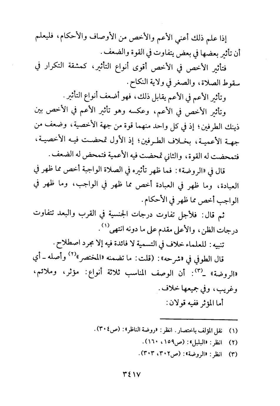 قَالَ الطوفي فِي " شَرحه ": (قلت: مَا تضمنه " الْمُخْتَصر " وَأَصله - أَي " الرَّوْضَة " -: أَن الْوَصْف الْمُنَاسب ثَلَاثَة أَنْوَاع: مُؤثر، وملائم، وغريب، وَفِي جَمِيعهَا خلاف.