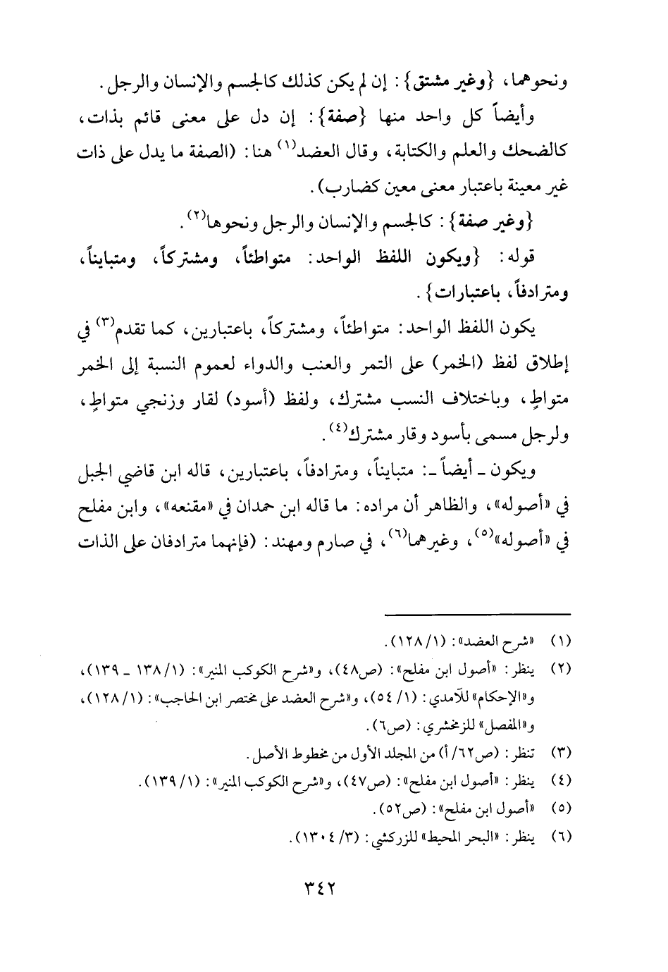 وَيكون - أَيْضا -: متبايناً، ومترادفاً، باعتبارين، قَالَه ابْن قَاضِي الْجَبَل فِي " أُصُوله "، وَالظَّاهِر أَن مُرَاده: مَا قَالَه ابْن حمدَان فِي مقنعه "، وَابْن مُفْلِح فِي " أُصُوله "، وَغَيرهمَا، فِي صارم ومهند: (فَإِنَّهُمَا مُتَرَادِفَانِ على الذَّات