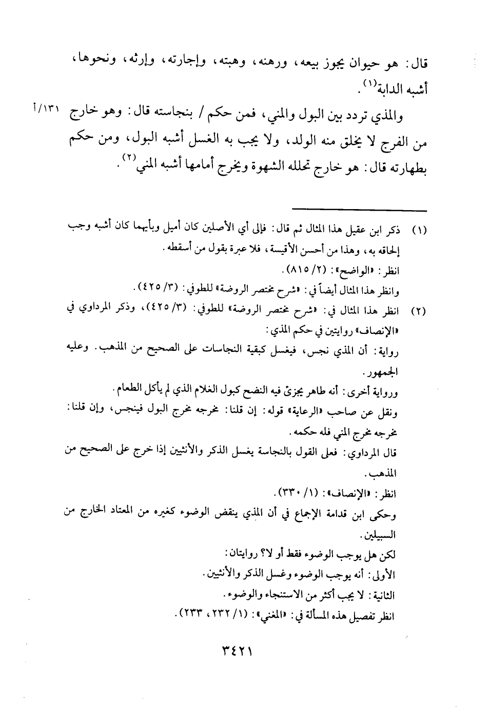 والمذي تردد بَين الْبَوْل والمني، فَمن حكم / بِنَجَاسَتِهِ قَالَ: وَهُوَ خَارج من الْفرج لَا يخلق مِنْهُ الْوَلَد، وَلَا يجب بِهِ الْغسْل أشبه الْبَوْل، وَمن حكم بِطَهَارَتِهِ قَالَ: هُوَ خَارج تحلله الشَّهْوَة وَيخرج أمامها أشبه الْمَنِيّ.