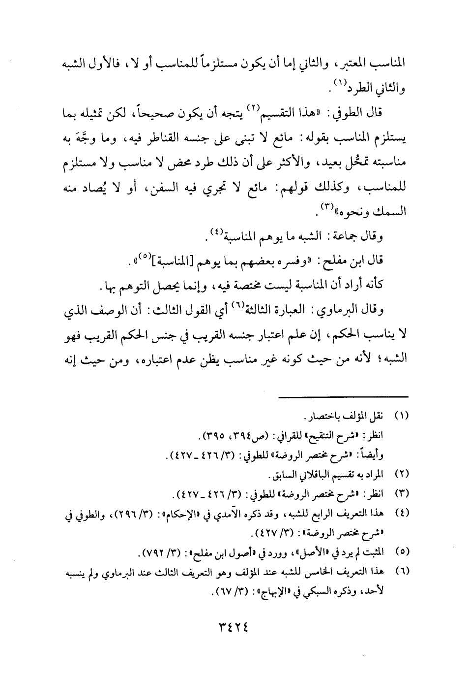 قَالَ الطوفي: " هَذَا التَّقْسِيم يتَّجه أَن يكون صَحِيحا، لَكِن تمثيله بِمَا يسْتَلْزم الْمُنَاسب بقوله: مَائِع لَا تبنى على جنسه القناطر فِيهِ، وَمَا وَجه بِهِ مناسبته تمحل بعيد، وَالْأَكْثَر على أَن ذَلِك طرد مَحْض لَا مُنَاسِب وَلَا مُسْتَلْزم للمناسب، وَكَذَلِكَ قَوْلهم: مَائِع لَا تجْرِي فِيهِ السفن، أَو لَا يصاد مِنْهُ السّمك وَنَحْوه ".