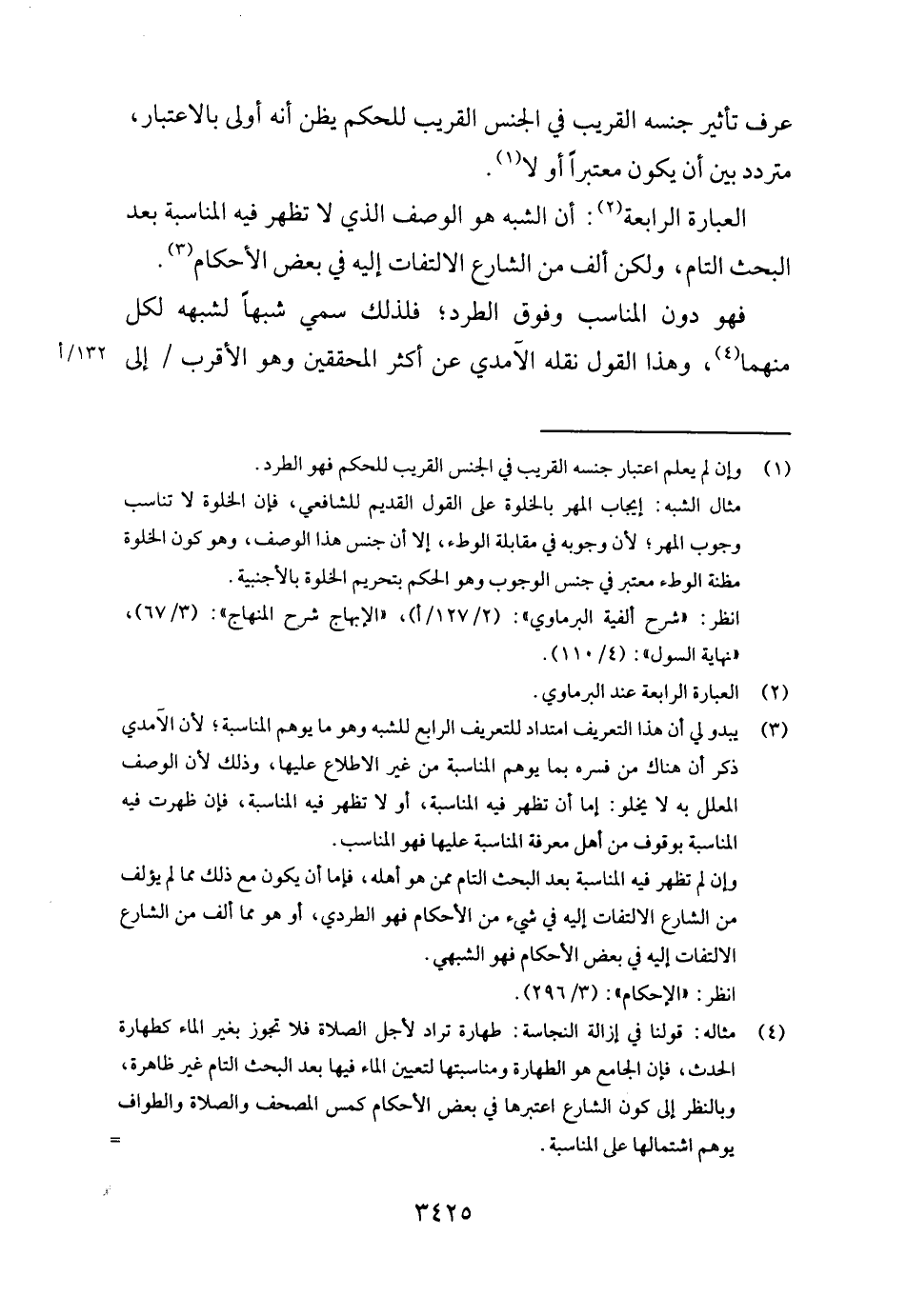 الْعبارَة الرَّابِعَة: أَن الشّبَه هُوَ الْوَصْف الَّذِي لَا تظهر فِيهِ الْمُنَاسبَة بعد الْبَحْث التَّام، وَلَكِن ألف من الشَّارِع الِالْتِفَات إِلَيْهِ فِي بعض الْأَحْكَام.