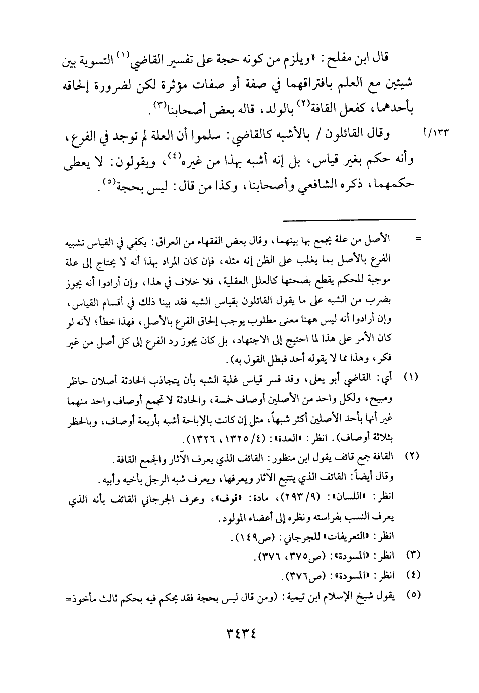 قَالَ ابْن مُفْلِح: " وَيلْزم من كَونه حجَّة على تَفْسِير القَاضِي التَّسْوِيَة بَين شَيْئَيْنِ مَعَ الْعلم بافتراقهما فِي صفة أَو صِفَات مُؤثرَة لَكِن لضَرُورَة إِلْحَاقه بِأَحَدِهِمَا، كَفعل الْقَافة بِالْوَلَدِ، قَالَه بعض أَصْحَابنَا.