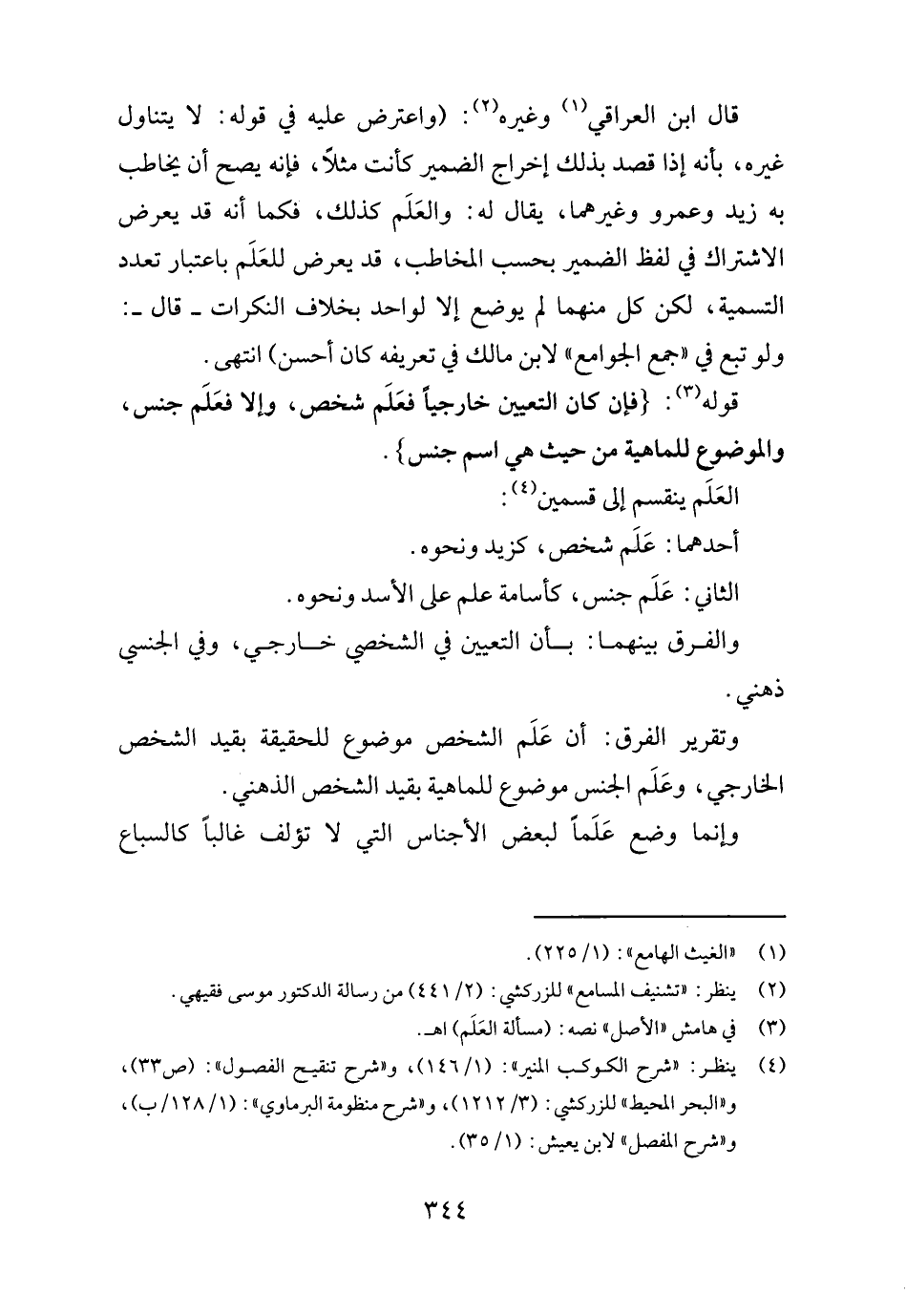 قَالَ ابْن الْعِرَاقِيّ وَغَيره: (وَاعْترض عَلَيْهِ فِي قَوْله: لَا يتَنَاوَل غَيره، بِأَنَّهُ إِذا قصد بذلك إِخْرَاج الضَّمِير كَأَنْت مثلا، فَإِنَّهُ يَصح أَن يُخَاطب بِهِ زيد وَعَمْرو وَغَيرهمَا، يُقَال لَهُ: وَالْعلم كَذَلِك، فَكَمَا أَنه قد يعرض الِاشْتِرَاك فِي لفظ الضَّمِير بِحَسب الْمُخَاطب، قد يعرض للْعلم بِاعْتِبَار تعدد التَّسْمِيَة، لَكِن كل مِنْهُمَا لم يوضع إِلَّا لوحد بِخِلَاف النكرات - قَالَ -: وَلَو تبع فِي " جمع الْجَوَامِع " لِابْنِ مَالك فِي تَعْرِيفه كَانَ أحسن) انْتهى.