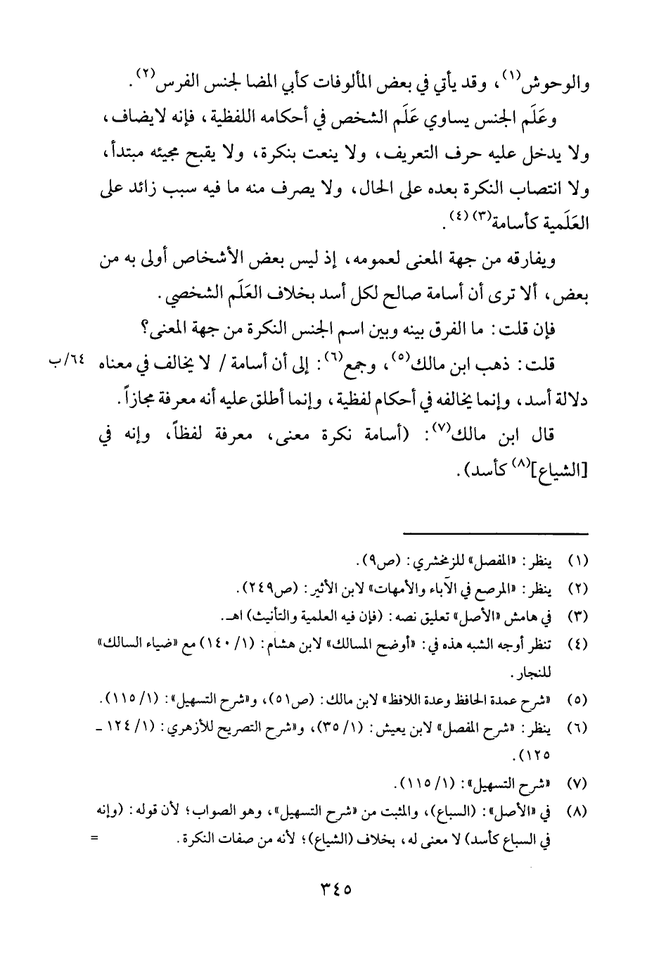 قلت: ذهب ابْن مَالك، وَجمع: إِلَى أَن أُسَامَة / لَا يُخَالف فِي مَعْنَاهُ دلَالَة أَسد، وَإِنَّمَا يُخَالِفهُ فِي أحاكم لفظية، وَإِنَّمَا أطلق عَلَيْهِ أَنه معرفَة مجَازًا.