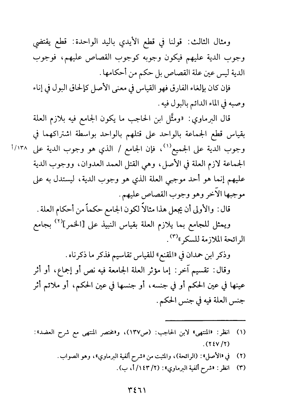 قَالَ الْبرمَاوِيّ: " وَمثل ابْن الْحَاجِب مَا يكون الْجَامِع فِيهِ بِلَازِم الْعلَّة بِقِيَاس قطع الْجَمَاعَة بِالْوَاحِدِ على قَتلهمْ بِالْوَاحِدِ بِوَاسِطَة اشتراكهما فِي وجوب الدِّيَة على الْجَمِيع، فَإِن الْجَامِع / الَّذِي هُوَ وجوب الدِّيَة على الْجَمَاعَة لَازم الْعلَّة فِي الأَصْل، وَهِي الْقَتْل الْعمد الْعدوان، وَوُجُوب الدِّيَة عَلَيْهِم إِنَّمَا هُوَ أحد موجبي الْعلَّة الَّذِي هُوَ وجوب الدِّيَة، ليستدل بِهِ على مُوجبهَا الآخر وَهُوَ وجوب الْقصاص عَلَيْهِم.