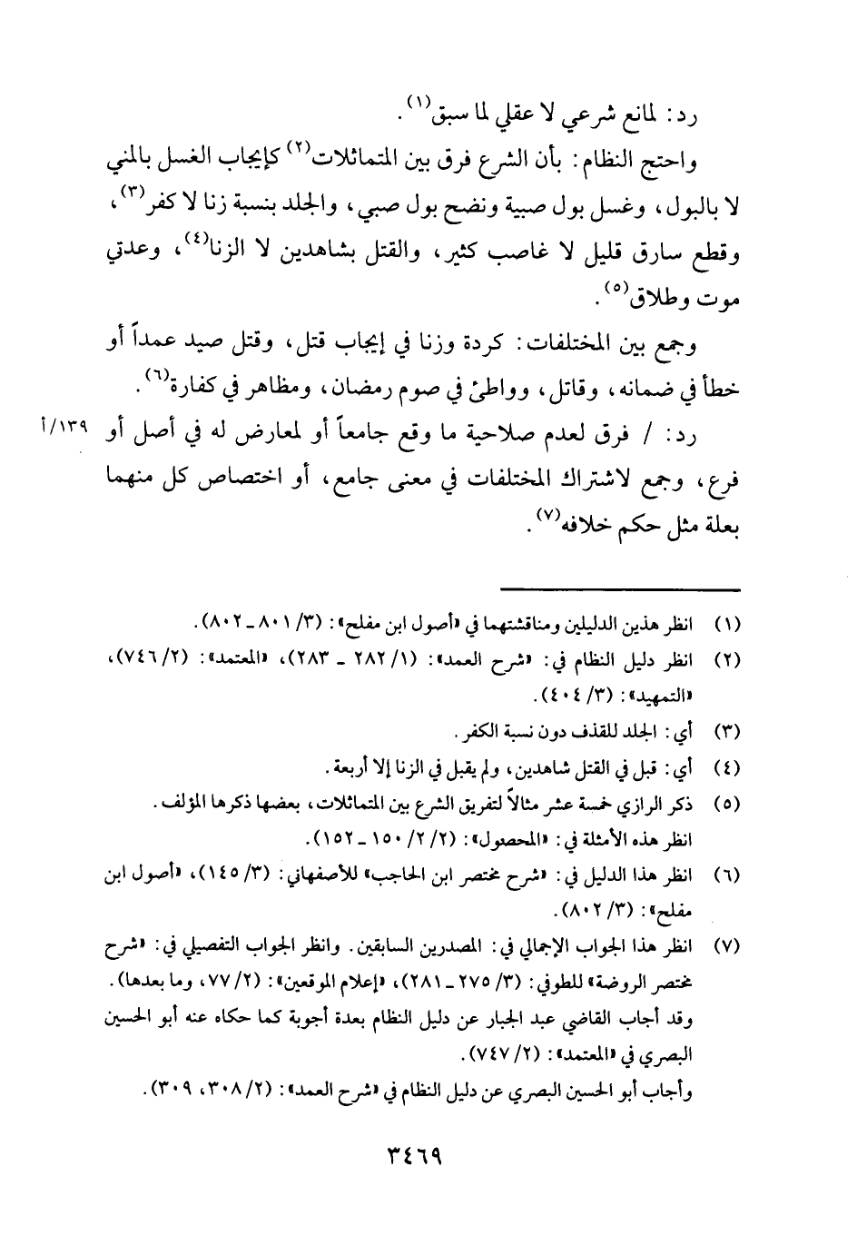 وَاحْتج النظام: بِأَن الشَّرْع فرق بَين المتماثلات كإيجاب الْغسْل بالمني لَا بالبول، وَغسل بَوْل صبية ونضح بَوْل صبي، وَالْجَلد بِنِسْبَة زنا لَا كفر، وَقطع سَارِق قَلِيل لَا غَاصِب كثير، وَالْقَتْل بِشَاهِدين لَا الزِّنَا، وعدتي موت وَطَلَاق.