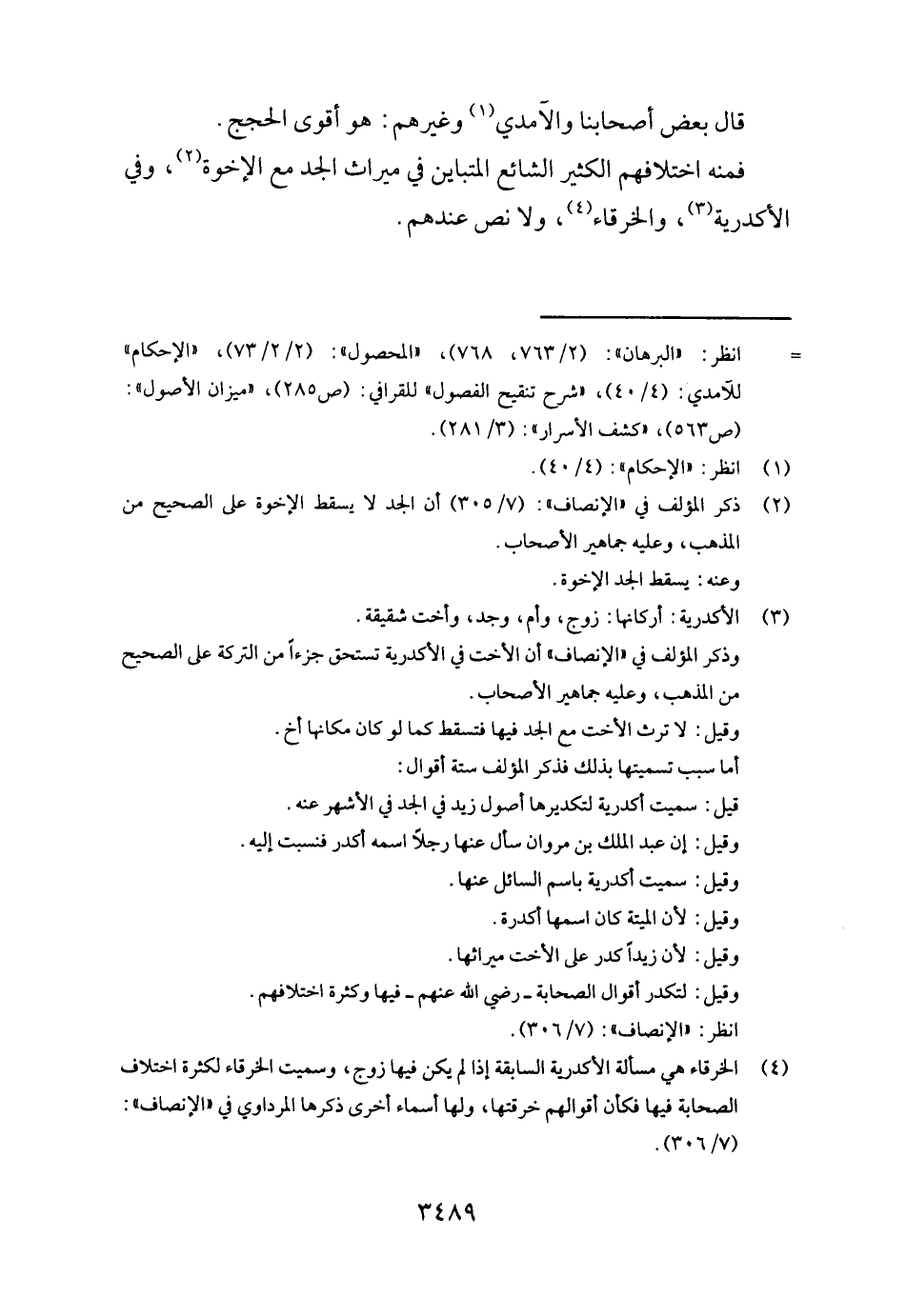 فَمِنْهُ اخْتلَافهمْ الْكثير الشَّائِع المتباين فِي مِيرَاث الْجد مَعَ الْإِخْوَة، وَفِي الأكدرية، والخرقاء، وَلَا نَص عِنْدهم.