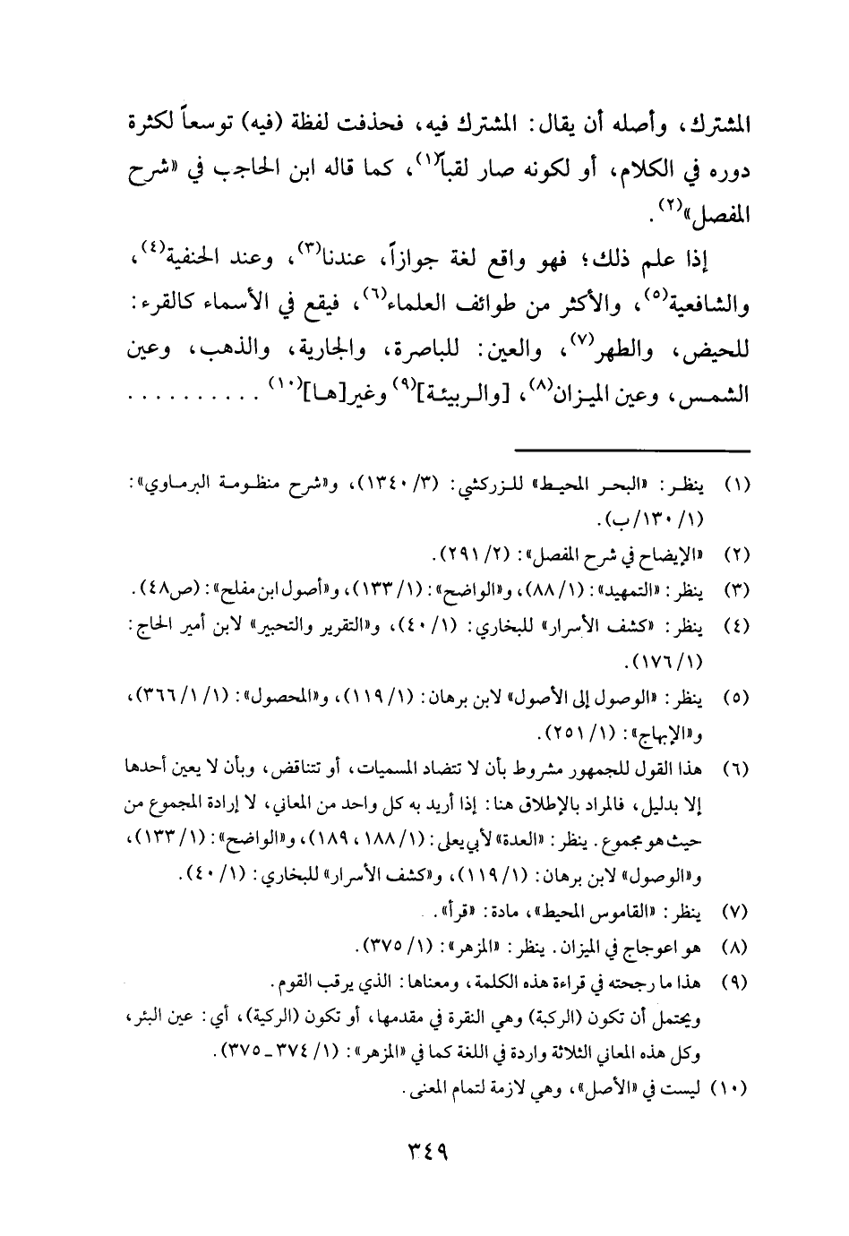 الْمُشْتَرك، وَأَصله أَن يُقَال: الْمُشْتَرك فِيهِ، فحذفت لَفْظَة (فِيهِ) توسعاً لِكَثْرَة دوره فِي الْكَلَام، أَو لكَونه صَار لقباً، كَمَا قَالَه ابْن الْحَاجِب فِي " شرح الْمفصل ".