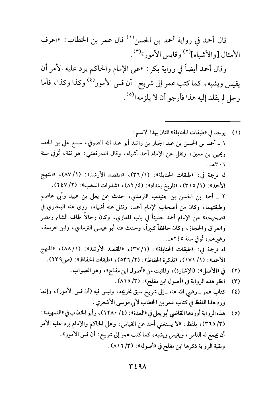 قَالَ أَحْمد فِي رِوَايَة أَحْمد بن الْحسن قَالَ عمر بن الْخطاب: " اعرف الْأَمْثَال [والأشباه] وقايس الْأُمُور ".