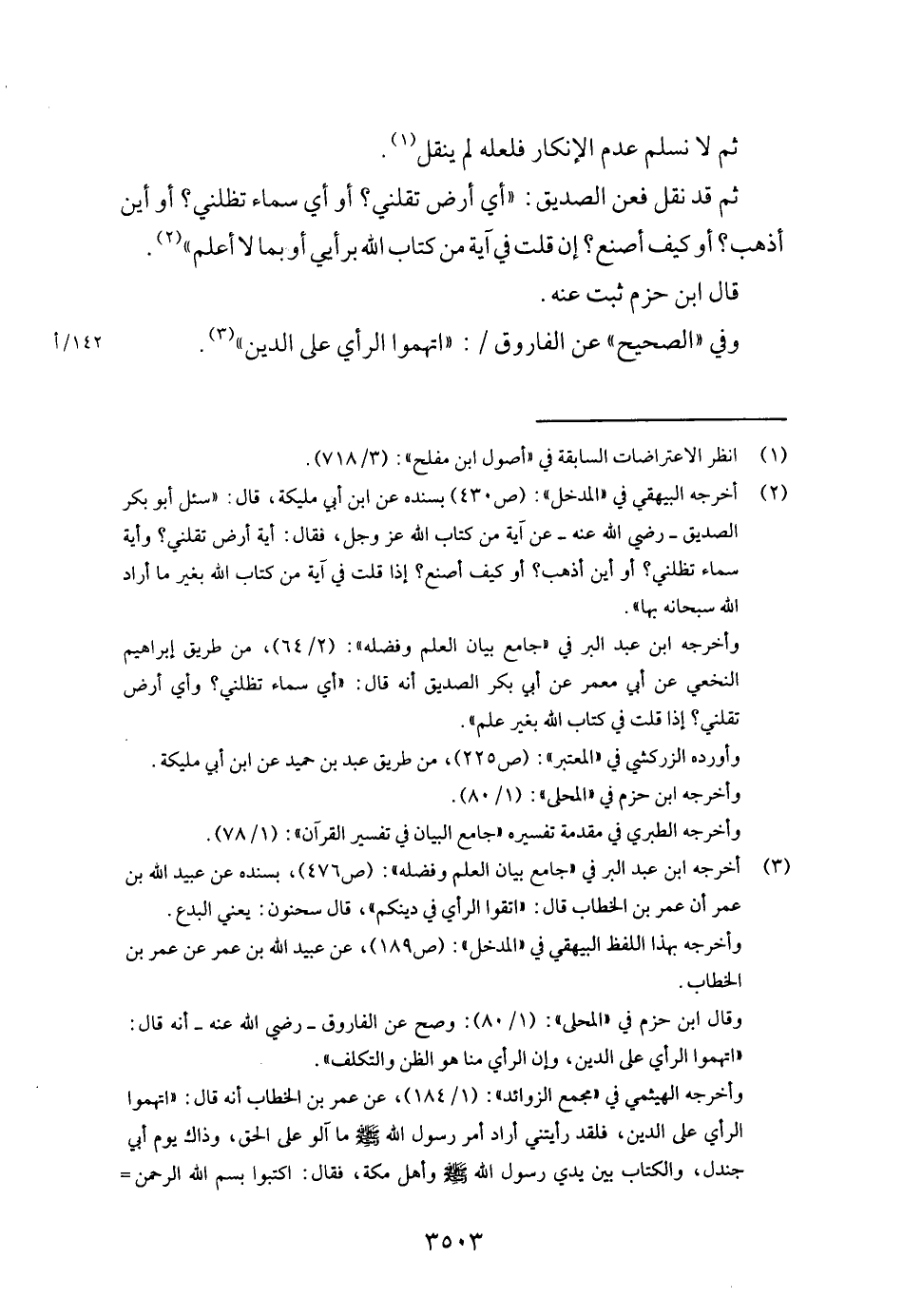 ثمَّ قد نقل فَعَن الصّديق: " أَي أَرض تُقِلني؟ أَو أَي سَمَاء تُظِلنِي؟ أَو أَيْن أذهب؟ أَو كَيفَ أصنع؟ أَن قلت فِي آيَة من كتاب اللَّهِ برأيي أَو بِمَا لَا أعلم ".