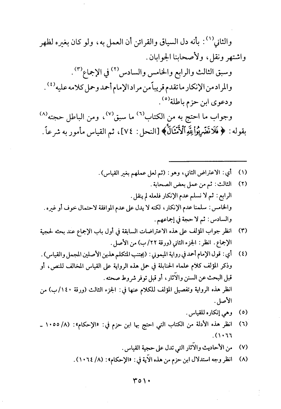 وَجَوَاب مَا احْتج بِهِ من الْكتاب مَا سبق، وَمن الْبَاطِل حجَّته بقوله: {فَلَا تضربوا لله الْأَمْثَال} [النَّحْل: ٧٤] ، ثمَّ الْقيَاس مَأْمُور بِهِ شرعا.