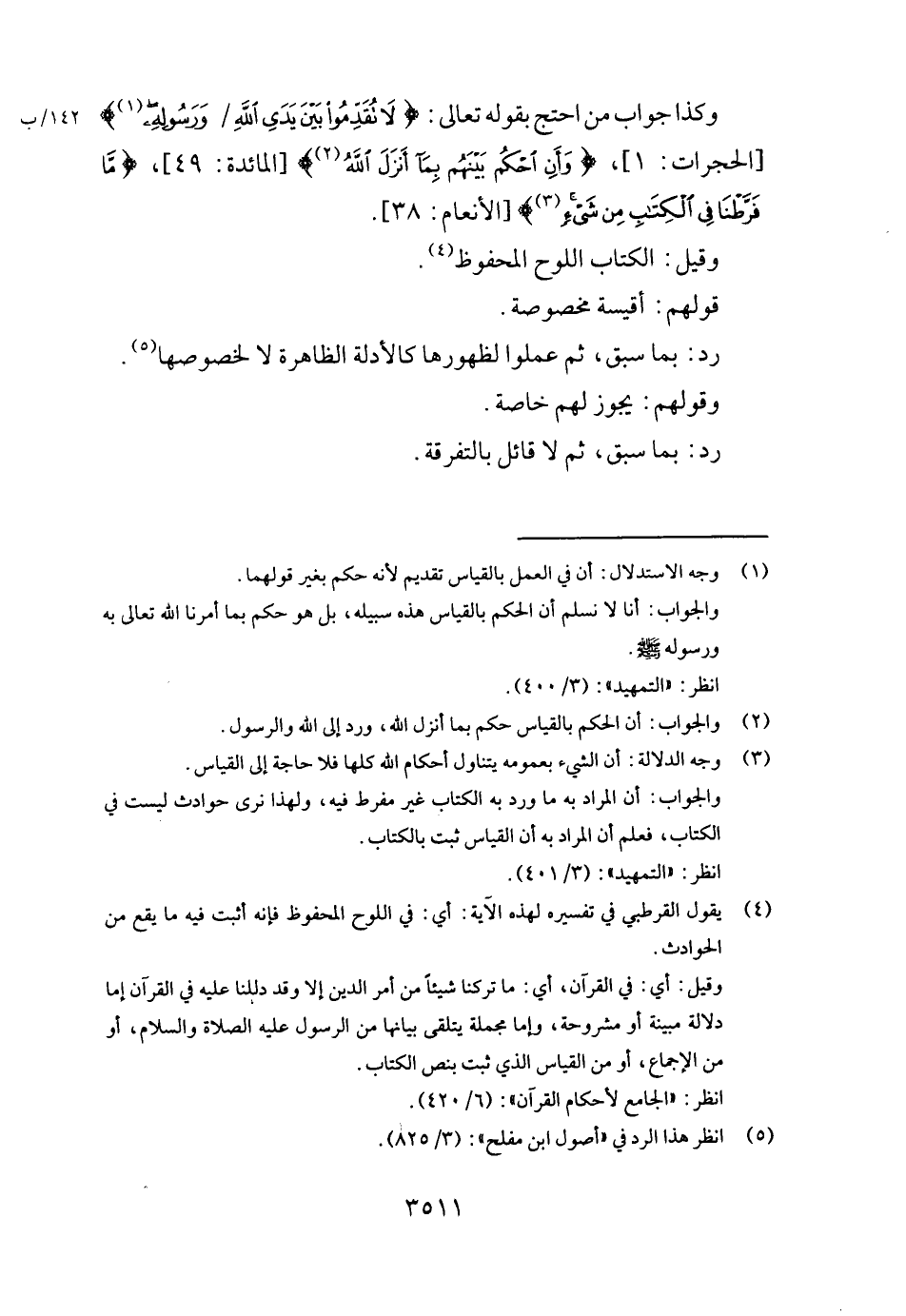 وَكَذَا جَوَاب من احْتج بقوله تَعَالَى: {لَا تقدمُوا بَين يَدي اللَّهِ / وَرَسُوله} [الحجرات: ١] ، {وَأَن احكم بَينهم بِمَا أنزل اللَّهِ} [الْمَائِدَة: ٤٩] ، {مَا فرطنا فِي الْكتاب من شَيْء} [الْأَنْعَام: ٣٨] .