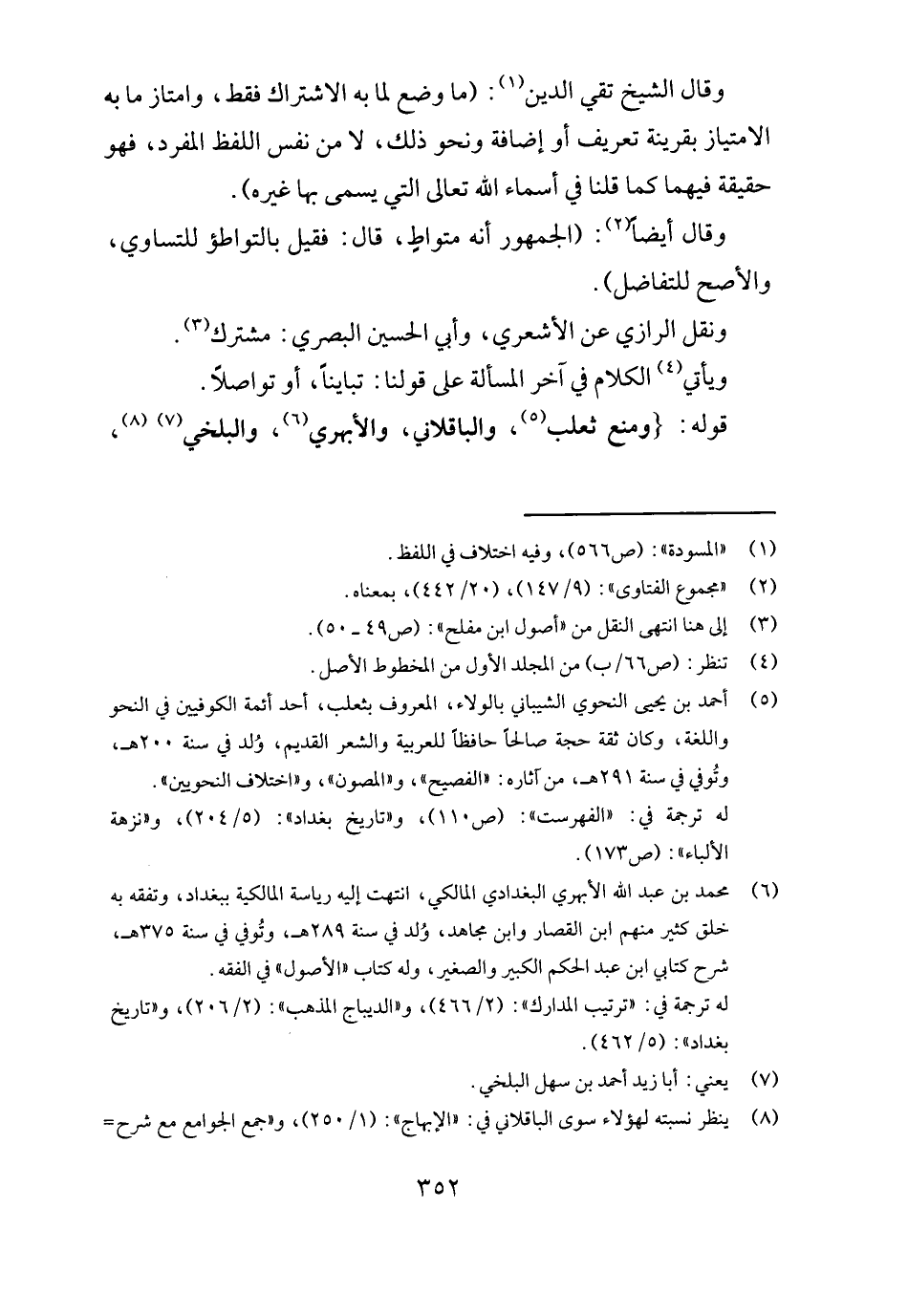وَقَالَ الشَّيْخ تَقِيّ الدّين: (مَا وضع لما بِهِ الِاشْتِرَاك فَقَط، وامتاز مَا بِهِ الامتياز بقرينه تَعْرِيف أَو إِضَافَة وَنَحْو ذَلِك، لَا من نفس اللَّفْظ الْمُفْرد، فَهُوَ حَقِيقَة فيهمَا كَمَا قُلْنَا فِي أَسمَاء الله تَعَالَى الَّتِي يُسمى بهَا غَيره) .