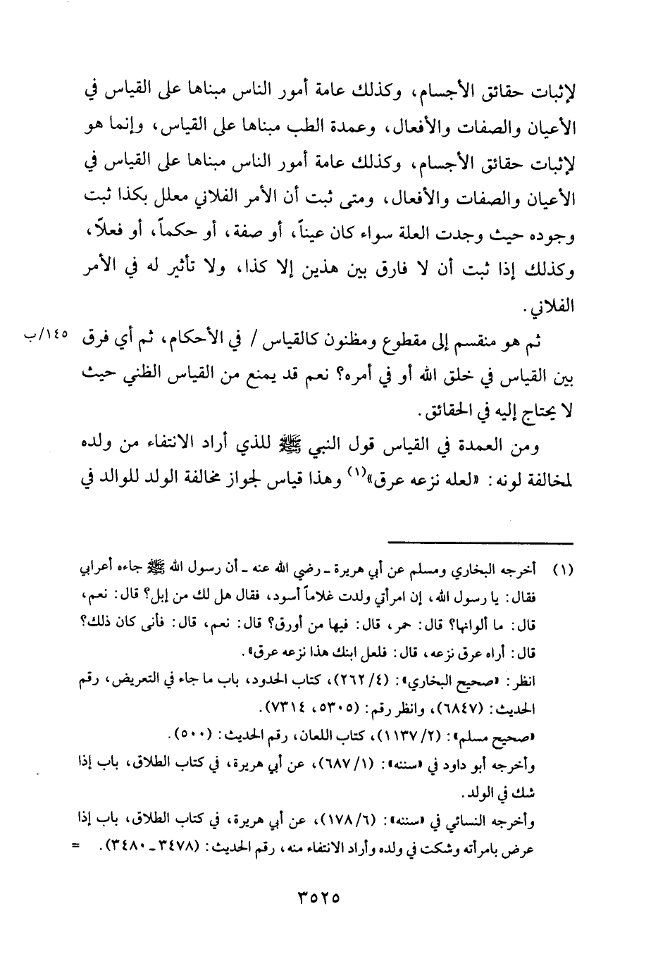 وَمن الْعُمْدَة فِي الْقيَاس قَول النَّبِي - صَلَّى اللَّهُ عَلَيْهِ وَسَلَّم َ - للَّذي أَرَادَ الانتفاء من وَلَده لمُخَالفَة لَونه: " لَعَلَّه نَزعه عرق " وَهَذَا قِيَاس لجَوَاز مُخَالفَة الْوَلَد للوالد فِي