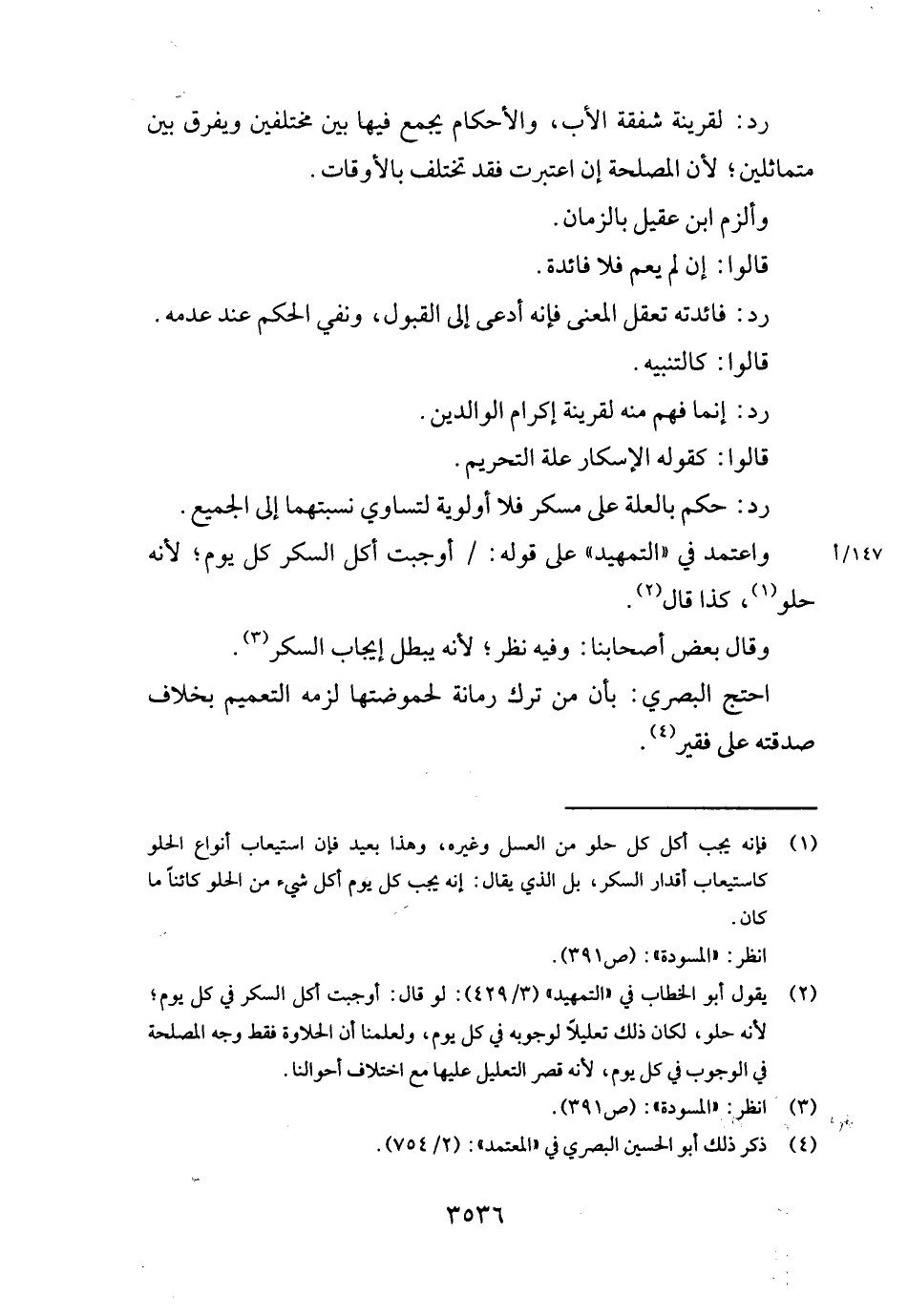 رد: حكم بِالْعِلَّةِ على مُسكر فَلَا أَوْلَوِيَّة لتساوي نسبتهما إِلَى الْجَمِيع. وَاعْتمد فِي " التَّمْهِيد " على قَوْله: / أوجبت أكل السكر كل يَوْم؛ لِأَنَّهُ حُلْو، كَذَا قَالَ.