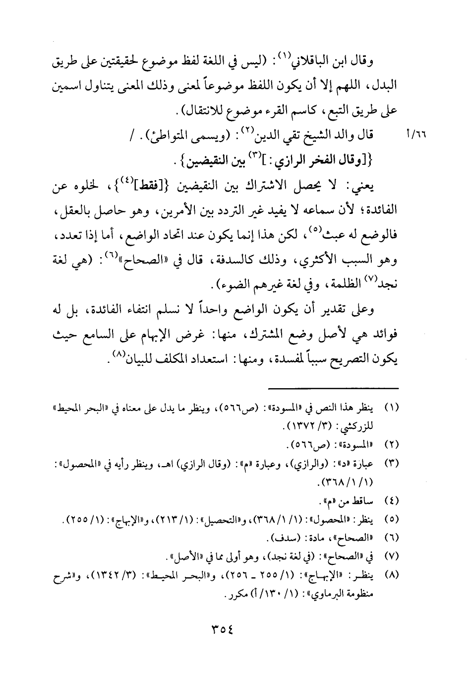 يَعْنِي: لَا يحصل الِاشْتِرَاك بَين النقيضين { [فَقَط] } ، لخلوه عَن الْفَائِدَة؛ لِأَن سَمَاعه لَا يُفِيد غير التَّرَدُّد بَين الْأَمريْنِ، وَهُوَ حَاصِل بِالْعقلِ، فالوضع لَهُ عَبث، لَكِن هَذَا إِنَّمَا يكون عِنْد اتِّحَاد الْوَاضِع، أما إِذا تعدد، وَهُوَ السَّبَب الأكثري، وَذَلِكَ كالسدفة، قَالَ فِي " الصِّحَاح ": (هِيَ لُغَة نجد الظلمَة، وَفِي لُغَة غَيرهم الضَّوْء) .