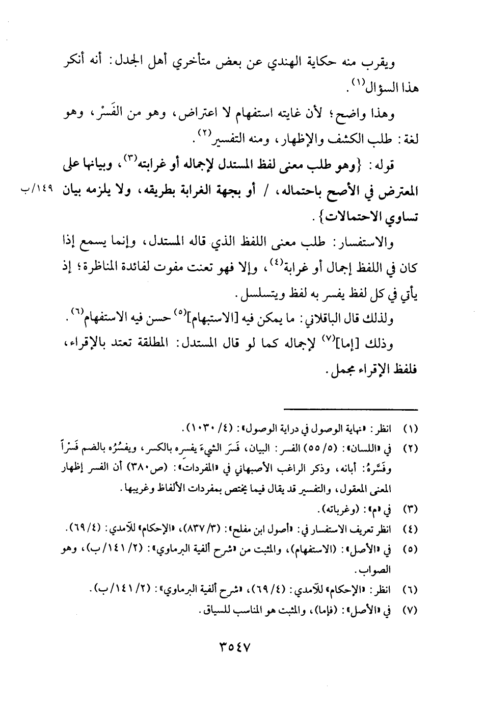 وَلذَلِك قَالَ الباقلاني: مَا يُمكن فِيهِ [الاستبهام] حسن فِيهِ الِاسْتِفْهَام. وَذَلِكَ [إِمَّا] لإجماله كَمَا لَو قَالَ الْمُسْتَدلّ: الْمُطلقَة تَعْتَد بالإقراء، فَلفظ الإقراء مُجمل.