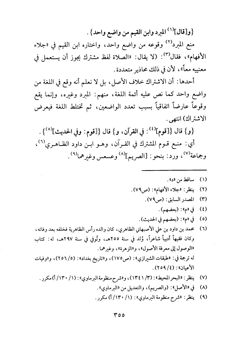 أَي: منع قوم الْمُشْتَرك فِي الْقُرْآن، وَهُوَ ابْن دَاوُد الظَّاهِرِيّ، وَجَمَاعَة، ورد: بِنَحْوِ [الصريم] وعسعس وَغَيرهمَا.