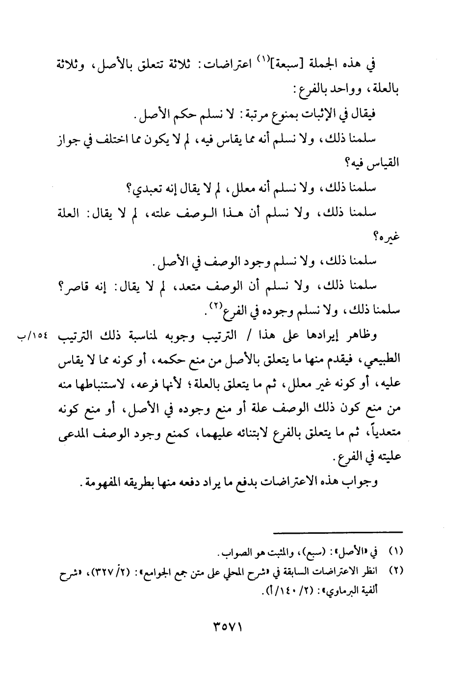 فِي هَذِه الْجُمْلَة [سَبْعَة] اعتراضات: ثَلَاثَة تتَعَلَّق بِالْأَصْلِ، وَثَلَاثَة بِالْعِلَّةِ، وَوَاحِد بالفرع: