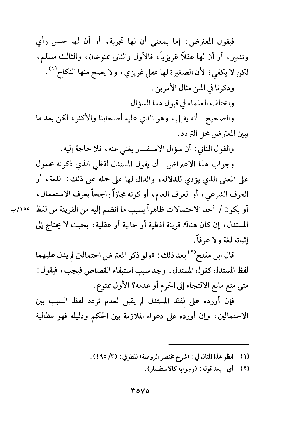 قَالَ ابْن مُفْلِح بعد ذَلِك: " وَلَو نذْكر الْمُعْتَرض احْتِمَالَيْنِ لم يدل عَلَيْهِمَا لفظ الْمُسْتَدلّ كَقَوْل الْمُسْتَدلّ: وجد سَبَب اسْتِيفَاء الْقصاص فَيجب، فَيَقُول: مَتى منع مَانع الالتجاء إِلَى الْحرم أَو عَدمه؟ الأول مَمْنُوع.