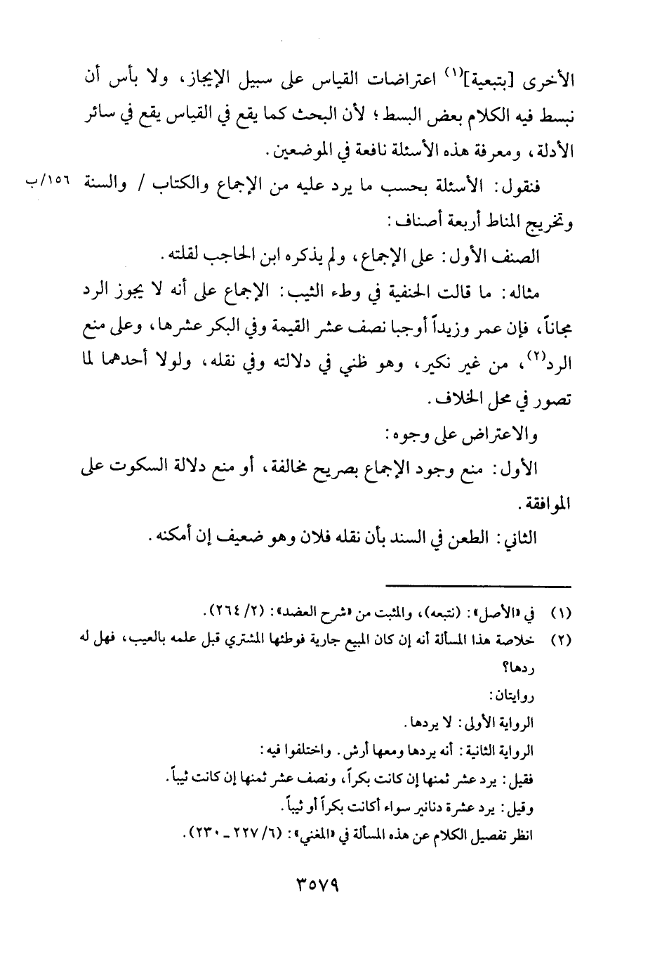 فَنَقُول: الأسئلة بِحَسب مَا يرد عَلَيْهِ من الْإِجْمَاع وَالْكتاب / وَالسّنة وَتَخْرِيج المناط أَرْبَعَة أَصْنَاف: الصِّنْف الأول: على الْإِجْمَاع، وَلم يذكرهُ ابْن الْحَاجِب لقلته.