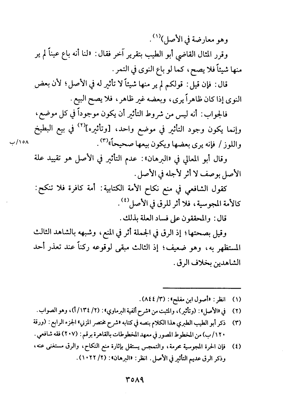 وَقَالَ أَبُو الْمَعَالِي فِي " الْبُرْهَان ": عدم التَّأْثِير فِي الأَصْل هُوَ تَقْيِيد عِلّة الأَصْل بِوَصْف لَا أثر لأَجله فِي الأَصْل. كَقَوْل الشَّافِعِي فِي منع نِكَاح الْأمة الْكِتَابِيَّة: أمة كَافِرَة فَلَا تنْكح كالأمة الْمَجُوسِيَّة، فَلَا أثر للرق فِي الأَصْل قَالَ: والمحققون على فَسَاد الْعلَّة بذلك.