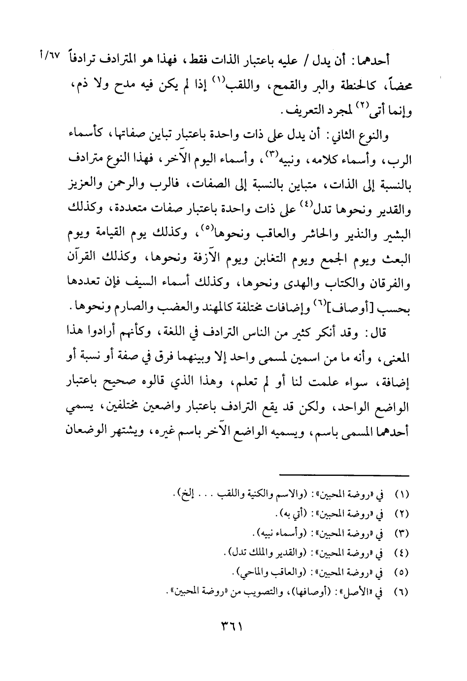 وَالنَّوْع الثَّانِي: أَن يدل على ذَات وَاحِدَة بِاعْتِبَار تبَاين صفاتها، كأسماء الرب، وَأَسْمَاء كَلَامه، وَنبيه، وَأَسْمَاء الْيَوْم الآخر، فَهَذَا النَّوْع مترادف بِالنِّسْبَةِ إِلَى الذَّات، متباين بِالنِّسْبَةِ إِلَى الصِّفَات، فالرب والرحمن والعزيز والقدير وَنَحْوهَا تدل على ذَات وَاحِدَة بِاعْتِبَار صِفَات مُتعَدِّدَة، وَكَذَلِكَ البشير والنذير والحاشر وَالْعَاقِب وَنَحْوهَا، وَكَذَلِكَ يَوْم الْقِيَامَة وَيَوْم الْبَعْث وَيَوْم الْجمع وَيَوْم التغابن وَيَوْم الآزفة وَنَحْوهَا، وَكَذَلِكَ الْقُرْآن وَالْفرْقَان وَالْكتاب وَالْهدى وَنَحْوهَا، وَكَذَلِكَ أَسمَاء السَّيْف فَإِن تعددها بِحَسب [أَوْصَاف] وإضافات مُخْتَلفَة كالمهند والعضب والصارم وَنَحْوهَا.